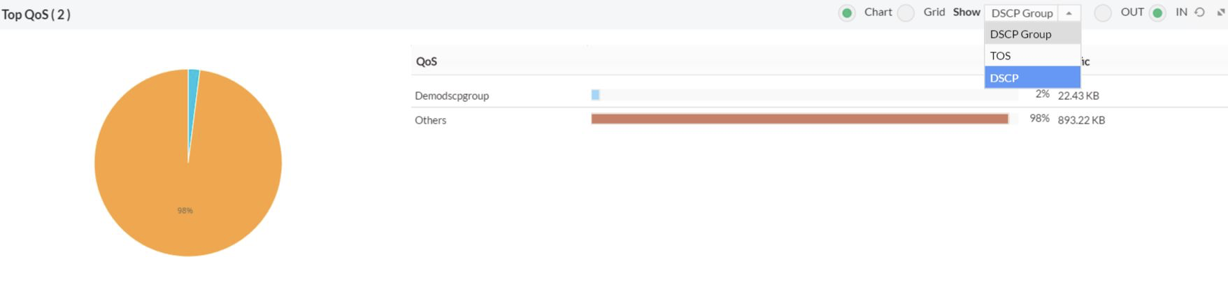 QoS功能在默认情况下,列出了主要DSCP流入报表。单击DSCP值旁边的 图标,会有弹窗给出详细的流量图。