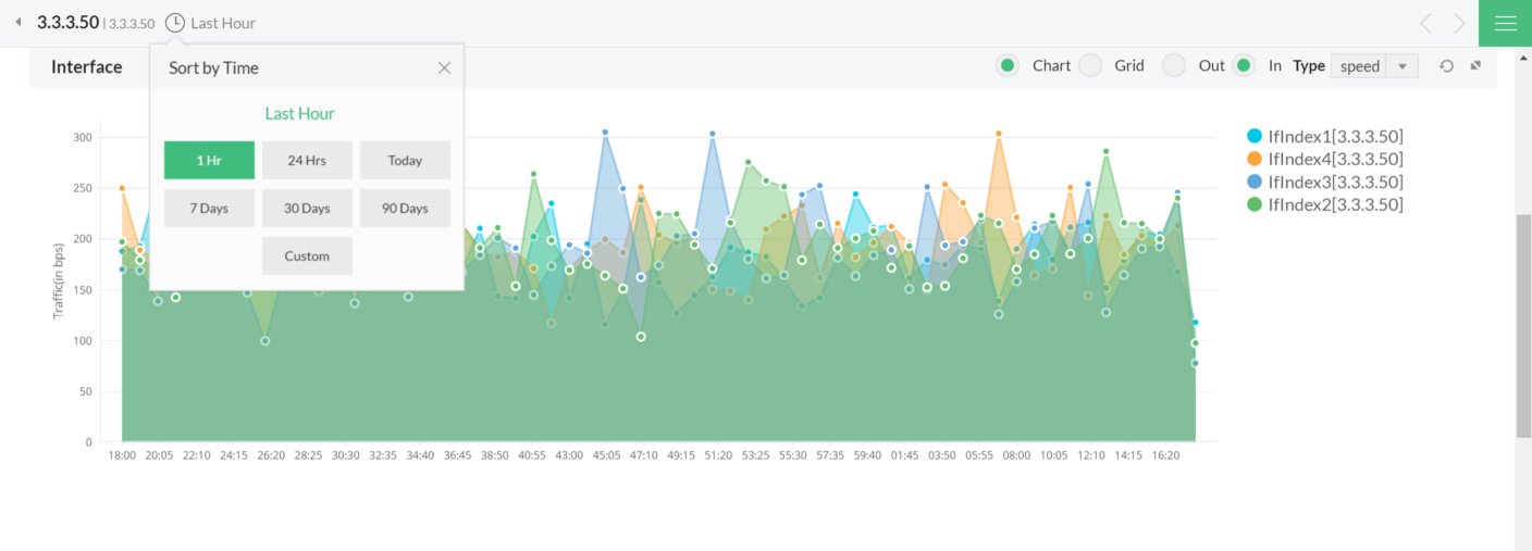 NetFlow Analyzer为您提供了挖掘流量图表的额外优势。将鼠标悬停在绘图区域上方时您可以看到"+ " - 十字线图标。点击图中的一个区域,按住鼠标,将其拖到您希望下钻的点(时间段)。例如 : 选择了上周的报表后,您可以选择其中两天来进行对比研究。您可以继续下钻到的最小时间段为1分钟。点击 "重置图"链接可以根据开始时间和系统时间之间的时间差将给您一个时间段。