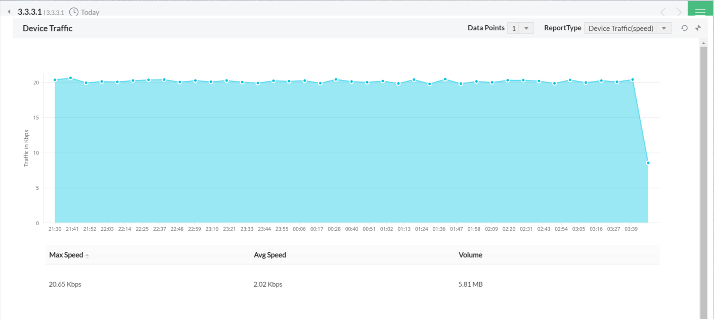 流量报表是根据流量、速度、带宽利用率和特定资源接收/发送的数据包数量来显示的。可以查看今天、最近15分钟、上个月的图表和数据点,也可以从左上方选择其他时间点。