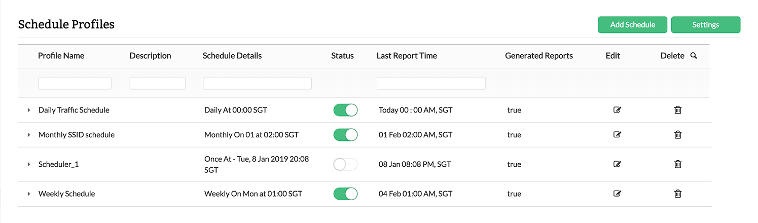 Netflow Analyzer每分钟计算指定接口、接口组、IP组、WLC设备、接入点组、SSID组的带宽利用率。根据选择的计划,以不同的时间间隔生成报表。计划报表功能使您可以创建新计划和删除现有计划。计划程序列表页面列出了所有现有计划,以及计划详细信息、状态、报表类型和最后一次报表生成时间。