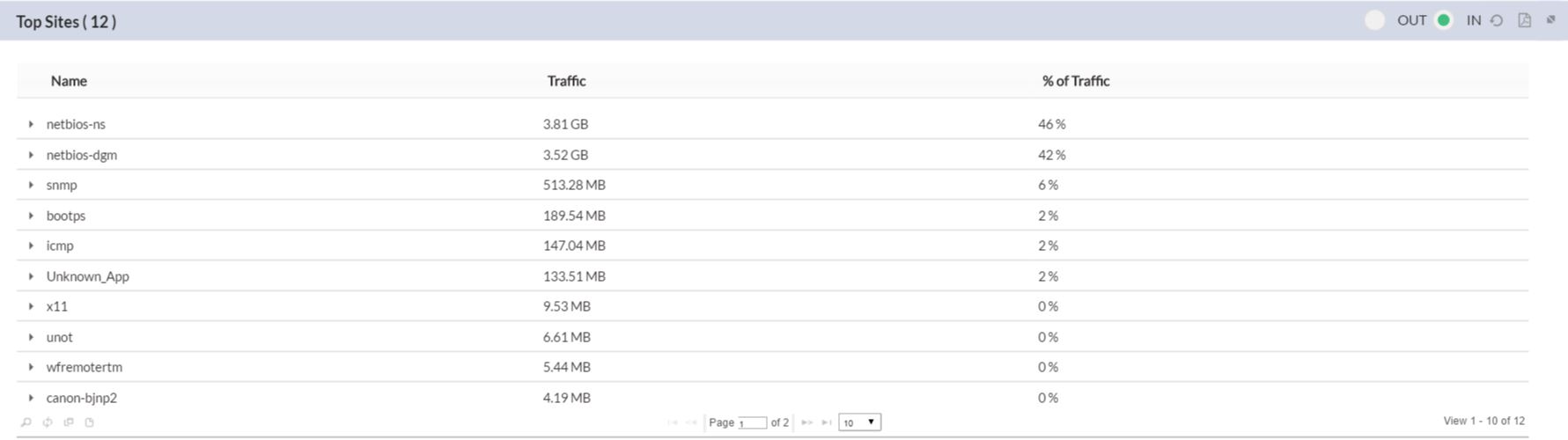 展开应用显示网站名称 (如果DNS被解析)和在您的网络中连接到网站的排行前10的设备名称 (如果DNS被解析) 。它还将根据每个IP地址通过该应用到网站的上传或下载量的流量利用率(以及总流量的百分比)提供流量的使用情况。您还可以查看每个应用的总的流量占比情况。报告详细介绍了通过应用程序从每个IP地址到特定站点的上传、下载量和流量占总流量的百分比。进一步下钻到网站名称可以了解到上传或下载流量和访问该网站的特定IP地址的信息。