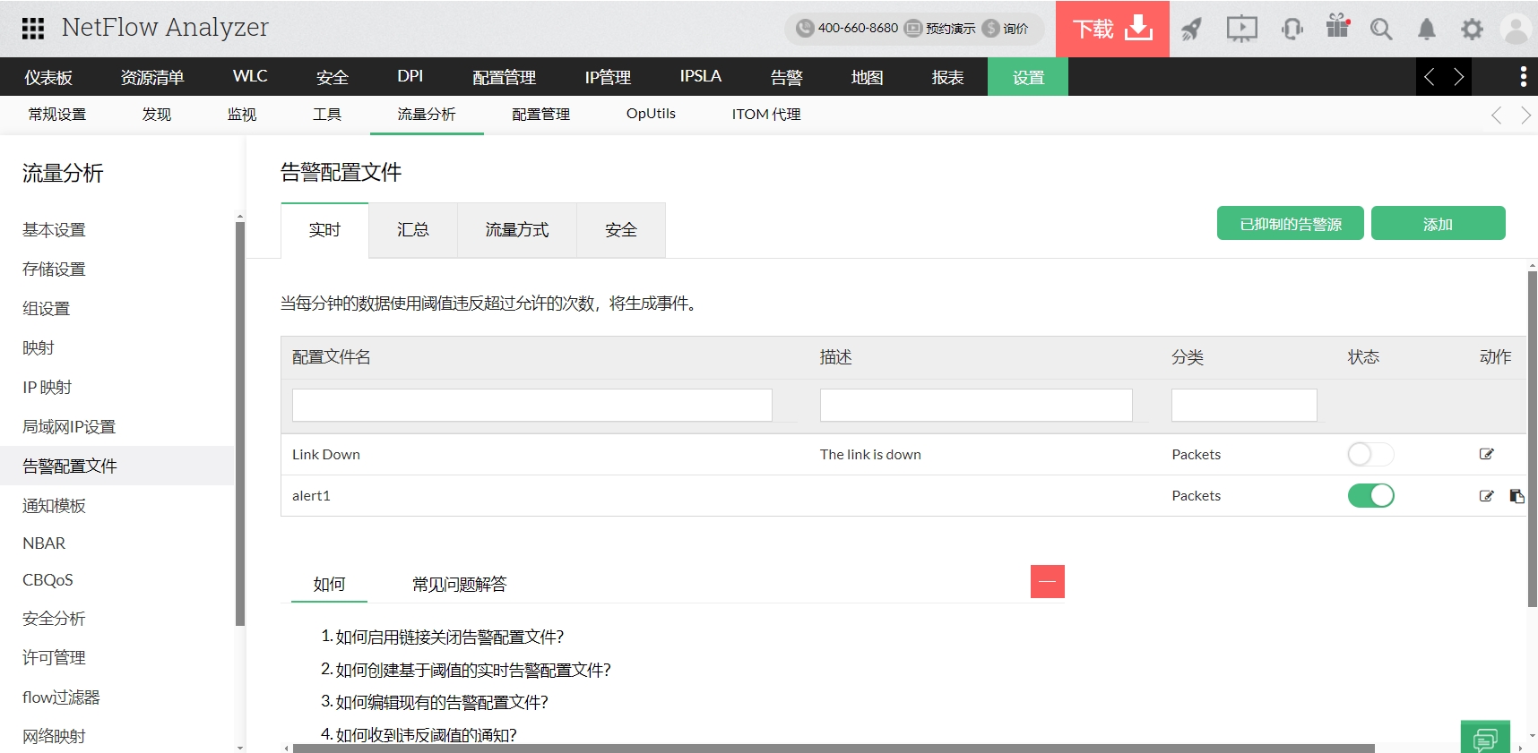 当网络出现峰值或下降、链接下降或带宽利用率增加时,警报会让您知道。
