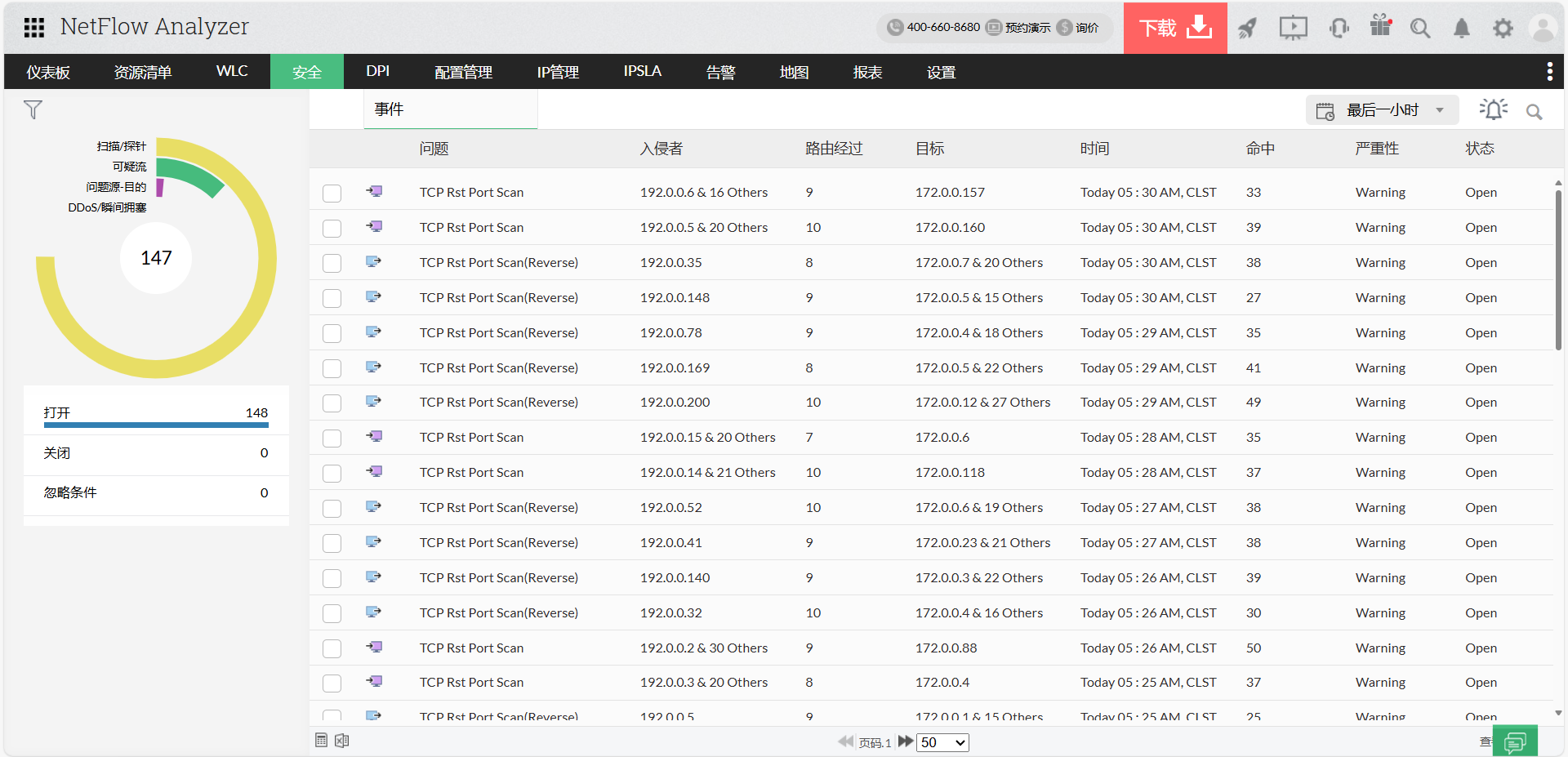NetFlow Analyzer通过它的高级安全分析模块(ASAM)帮助您检测内部和外部的安全威胁、零日攻击和网络异常。