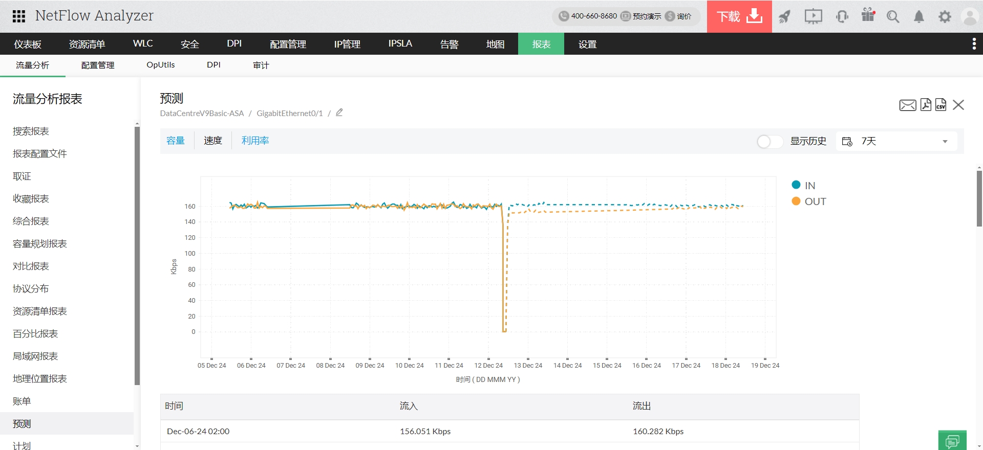 许多IT管理员希望拥有一个能够准确预测瓶颈和其他故障的网络流量管理器,从而能够在性能问题出现之前修复它们。NetFlow Analyzer采用自相关、季节性趋势损耗分解和回归等技术来预测带宽使用趋势。通过容量规划特性,它还可以让您全面了解流量活动和带宽使用趋势,以及流量和应用程序的增长,还可以帮助您在规划带宽需求方面做出明智的决定,并识别流量的任何异常增长。