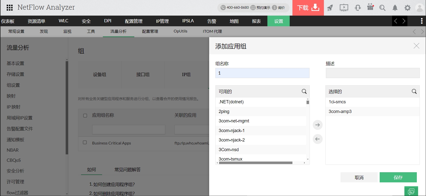 NetFlow Analyzer也有助于监控应用组,可通过将所需的应用添加到一个组中来创建组。因此可以轻松监控业务关健型应用。