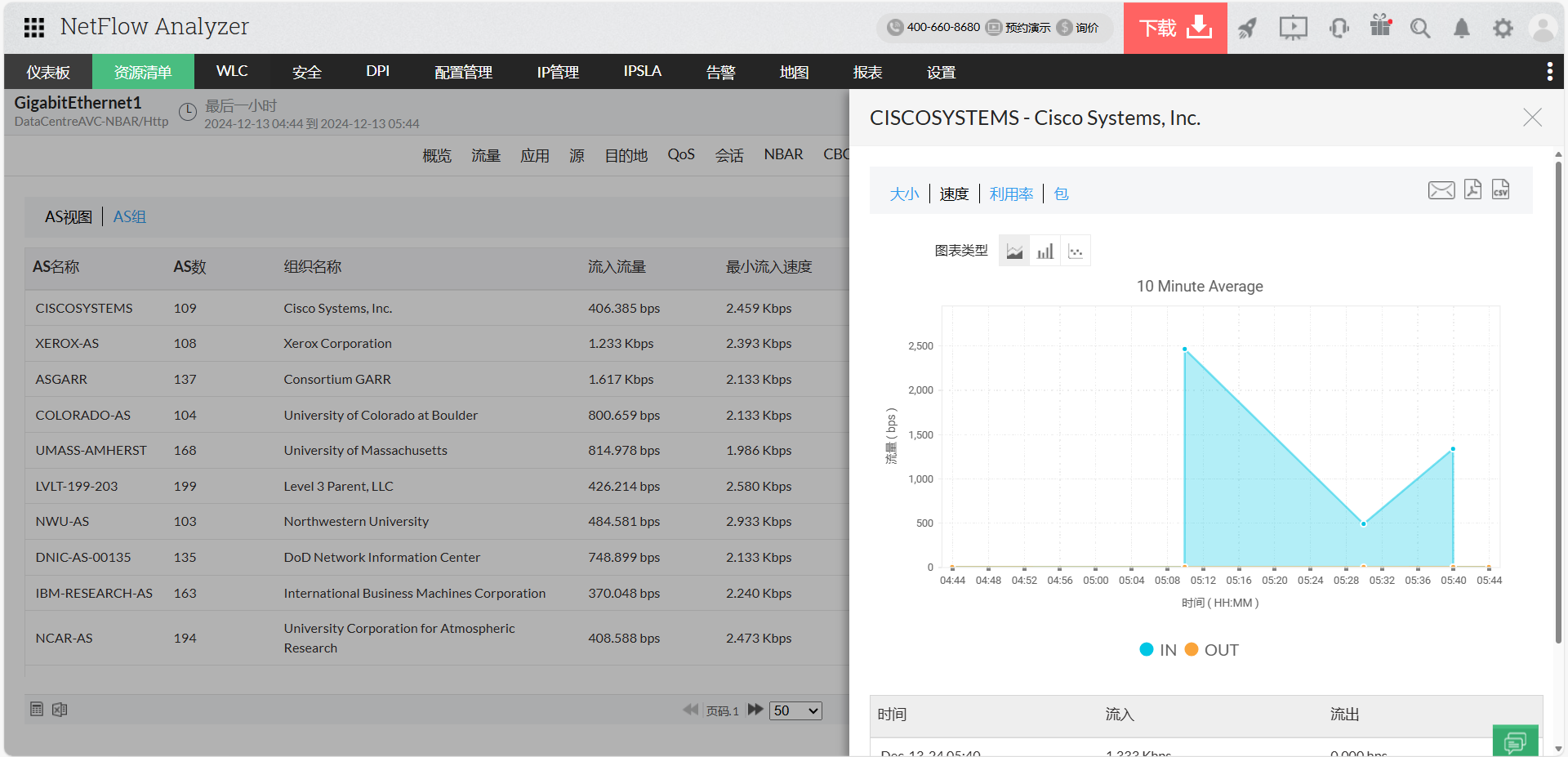 当您的组织希望有效地管理您的网络路由并定义了AS编号时,NetFlow Analyzer中的自治系统报告将为每个AS编号提供流量消耗。向下钻取以查看每个AS值的IN和OUT通信量,并通过pdf或csv导出报告。