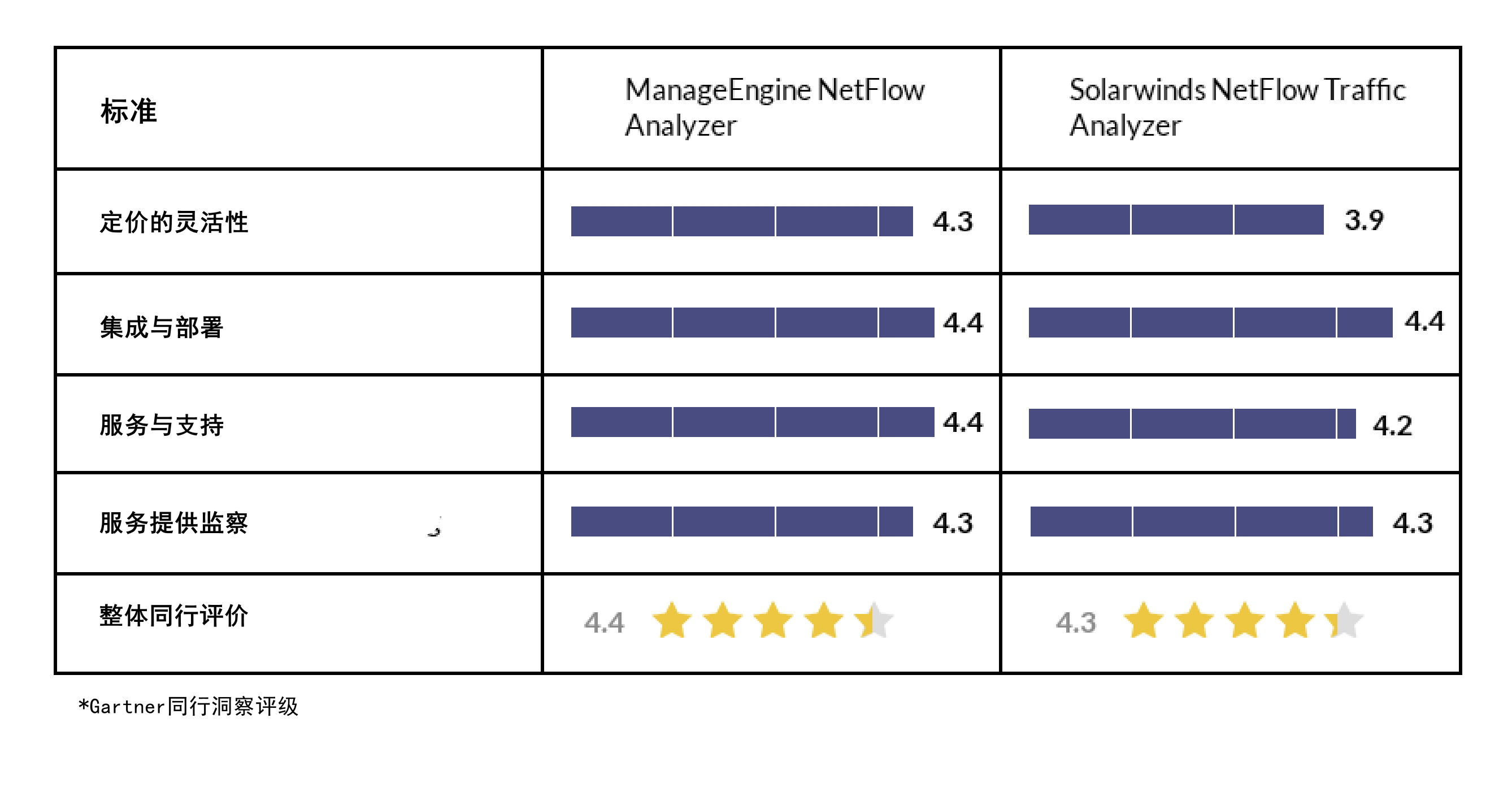 一个高效的网络流量分析工具应该能够深入了解网络中正在发生的事情,并帮助您在没有太多麻烦的情况下解决停机时间和异常问题。凭借其用户友好的GUI、深入的监控功能和可定制的报告选项,这正是NetFlow Analyzer与同类产品相比打分的原因。