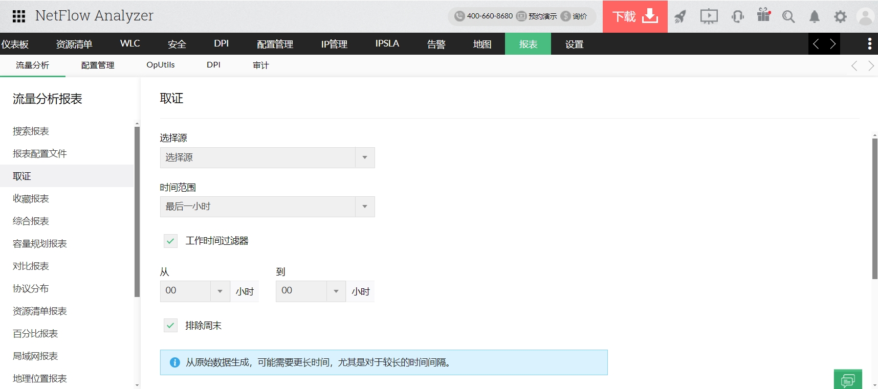 取证让您可以了解任何特定实例的特定参数,例如流量、应用程序、源地址、目标地址、DSCP等。这让您可以识别网络问题和异常的根本原因,以便更快排除故障。为了有效地使用求证,建议安装HighPerf附加组件,以便存储更大量的原始数据,加快报表生成。您只需要选择特定设备及其接口,定义多个条件和特定时期,然后点击“生成报表“。
