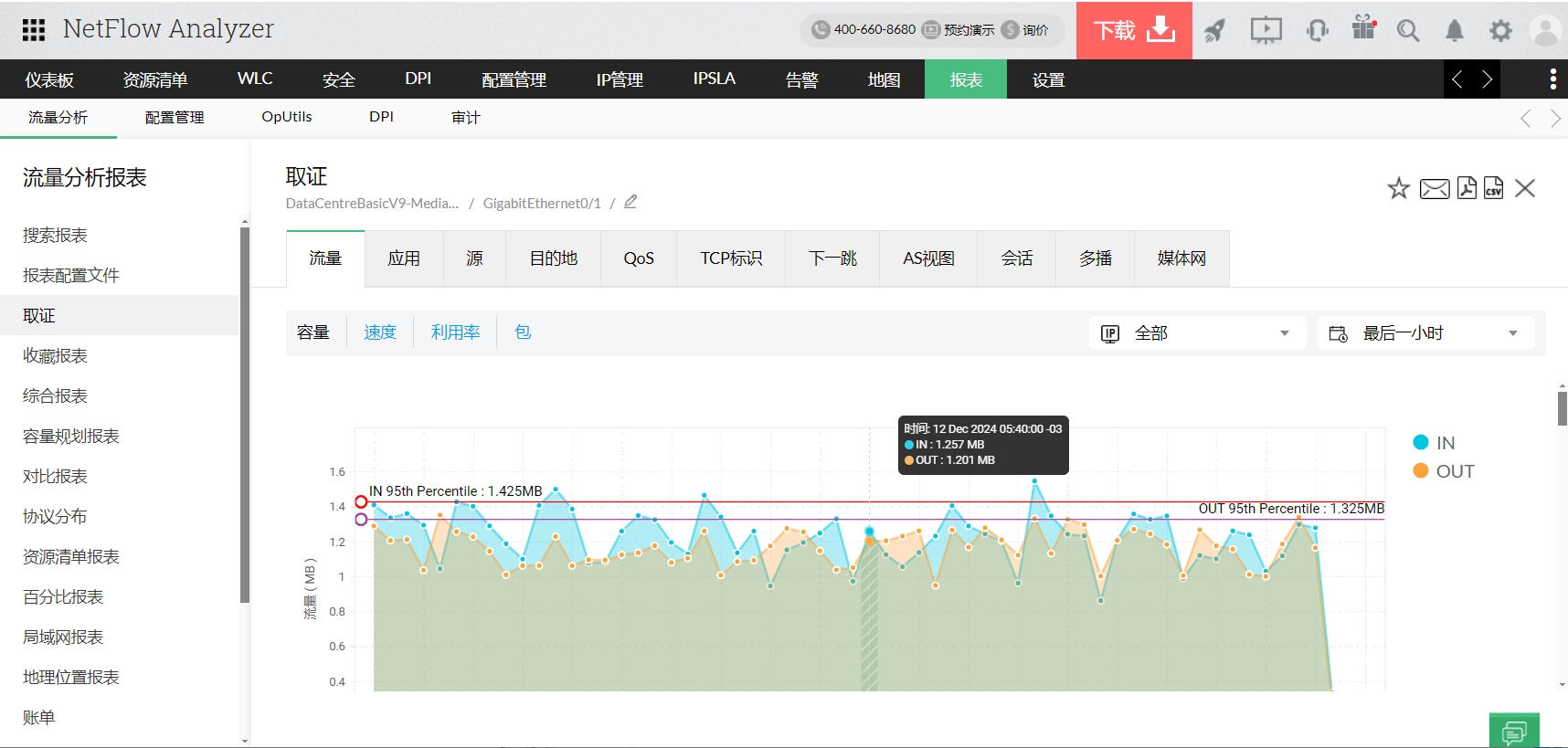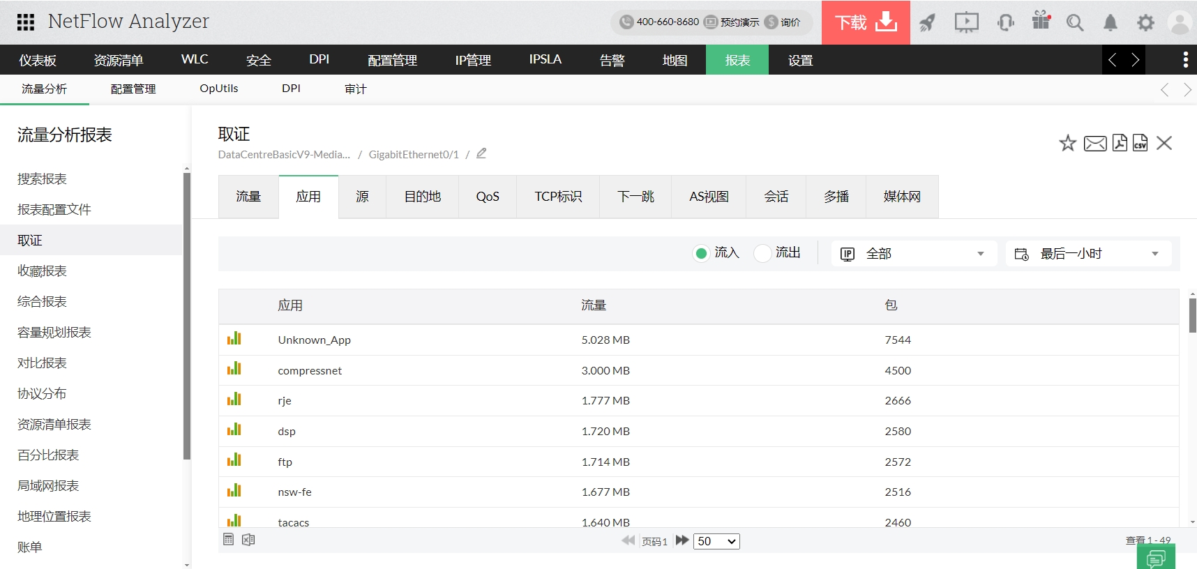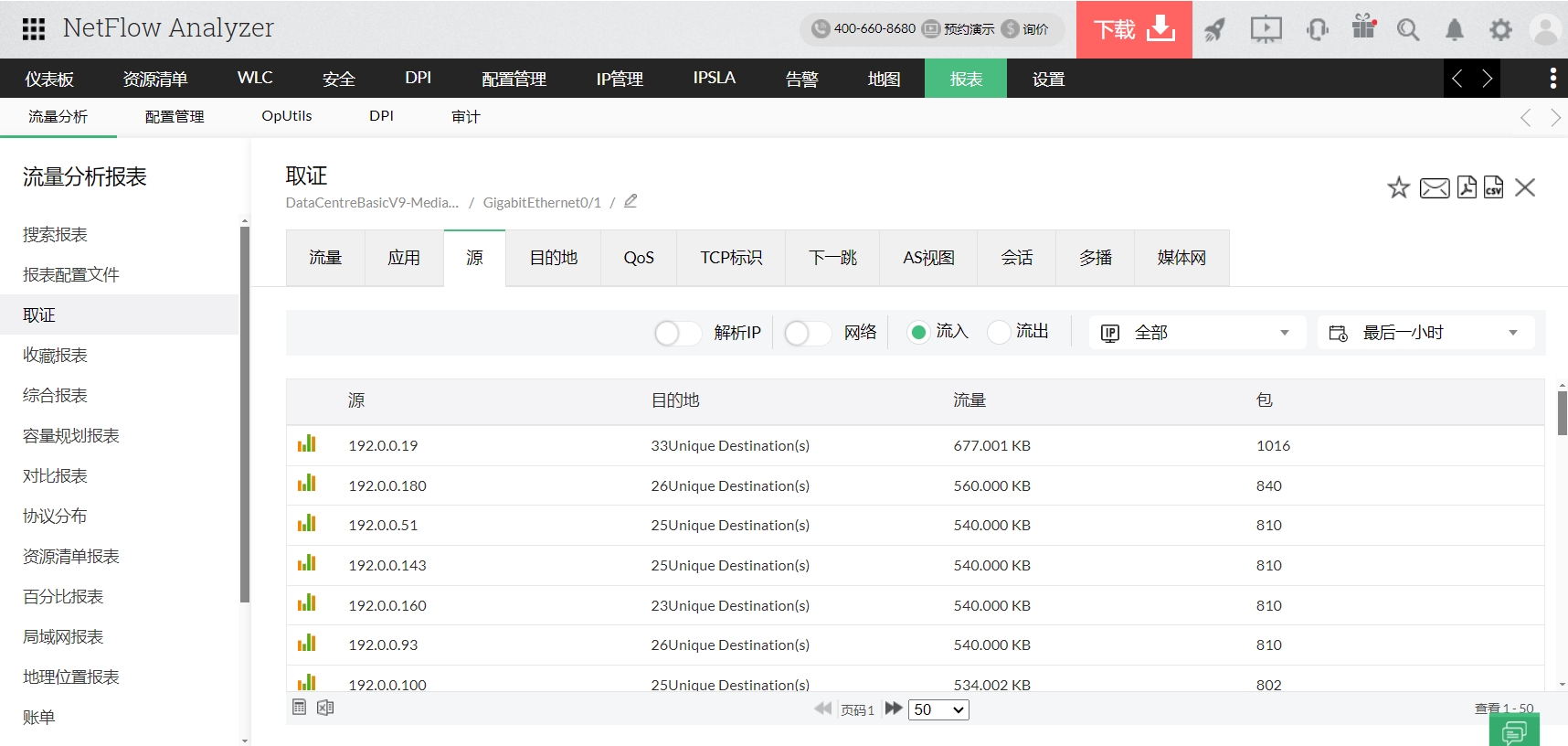 在报表中您可查看为您使用表格或图形视图选定的特定时期的流量、应用程序、来源、目的地、会话等(参见上面的图片)。通过它可深入了解过去的网络流量和带宽利用率。