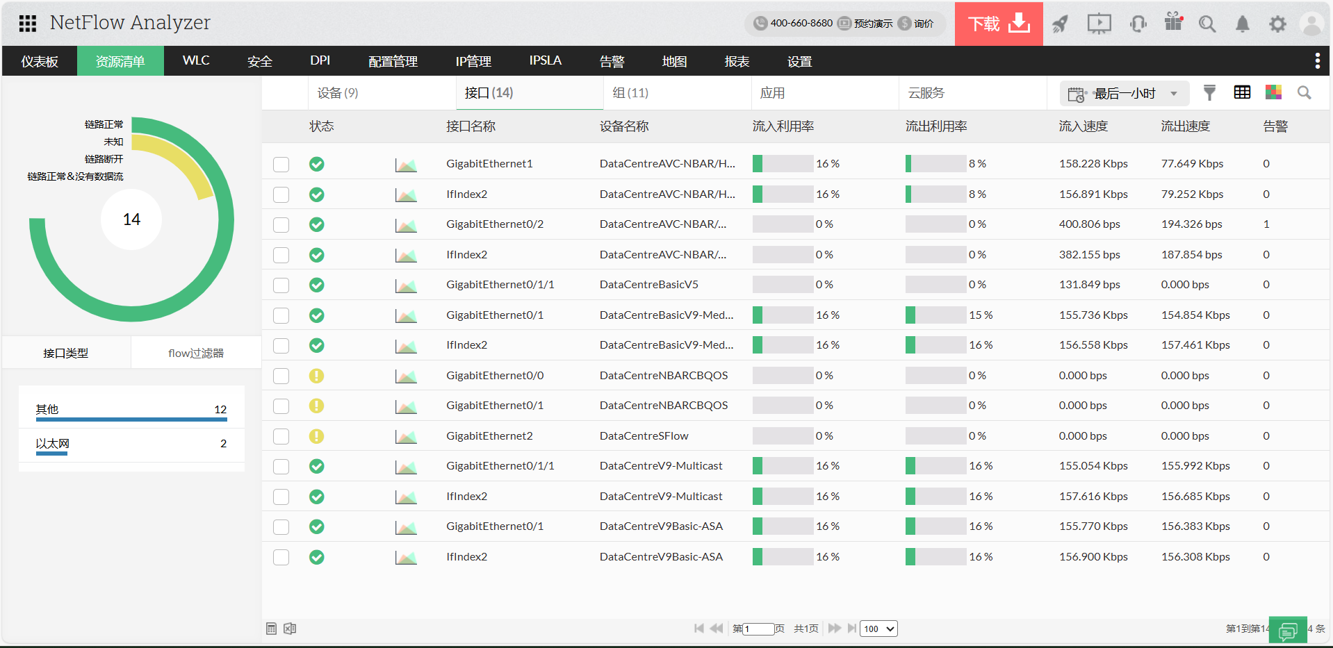 NetFlow Analyzer中的分组选项允许您创建广泛的基本组数组,这些组随设备、接口、IP地址和应用程序的不同而不同,也可以使用更多的技术组类型,如DSCP组,接入点组,SSID组更详细,累计组。生成所需的组后,在接口视图中查看所有组的通信量。诸如流量、流量和警报等细节可以很容易地监控。