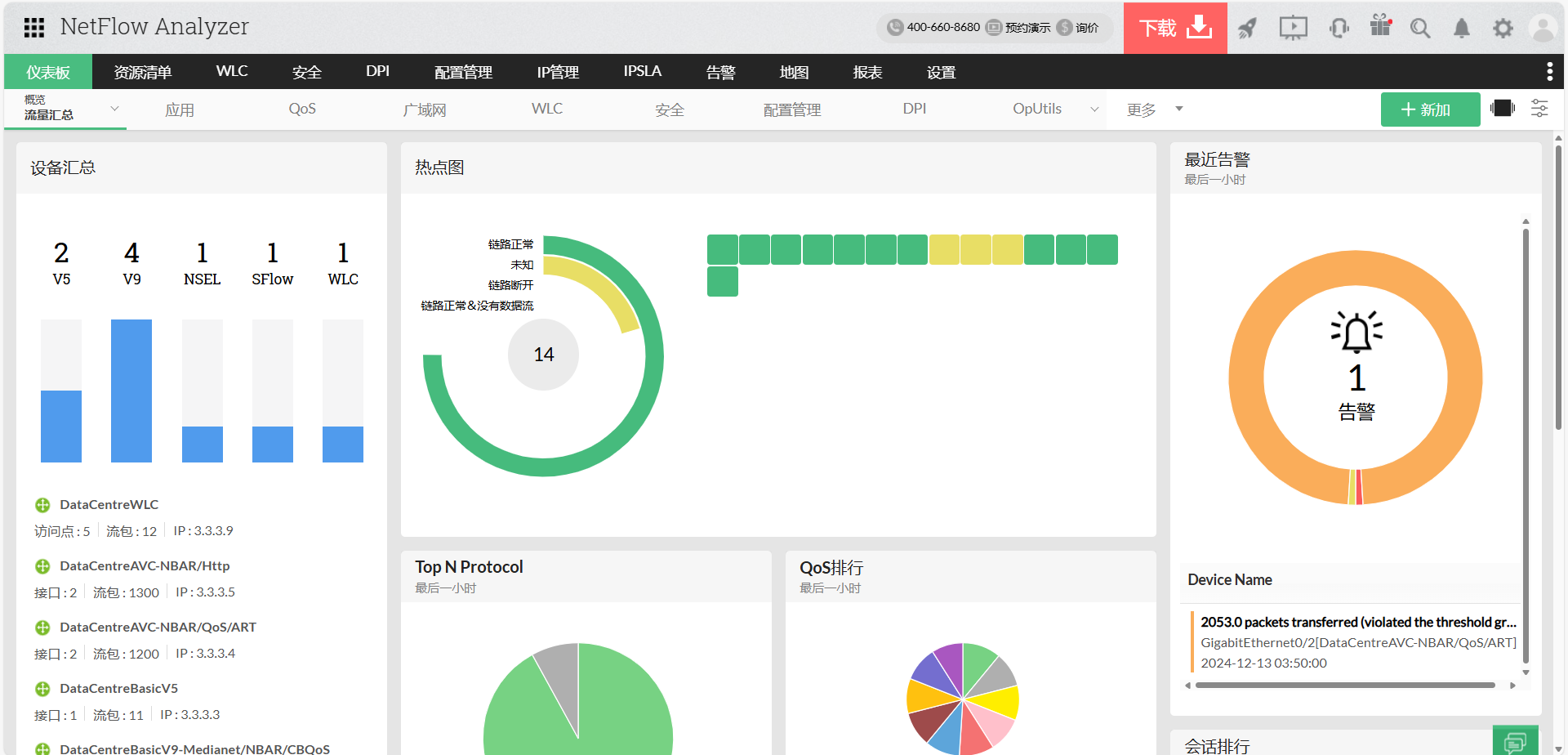 ManageEngine NetFlow Analyzer是一个基于流的流量监控工具,它收集、分析网络的流量数据,并将其分类为可读的图表、表格和报告。这些可视化所提供的一些信息包括网络性能图、关于带宽消耗的详细报告、网络中的顶级对话等。