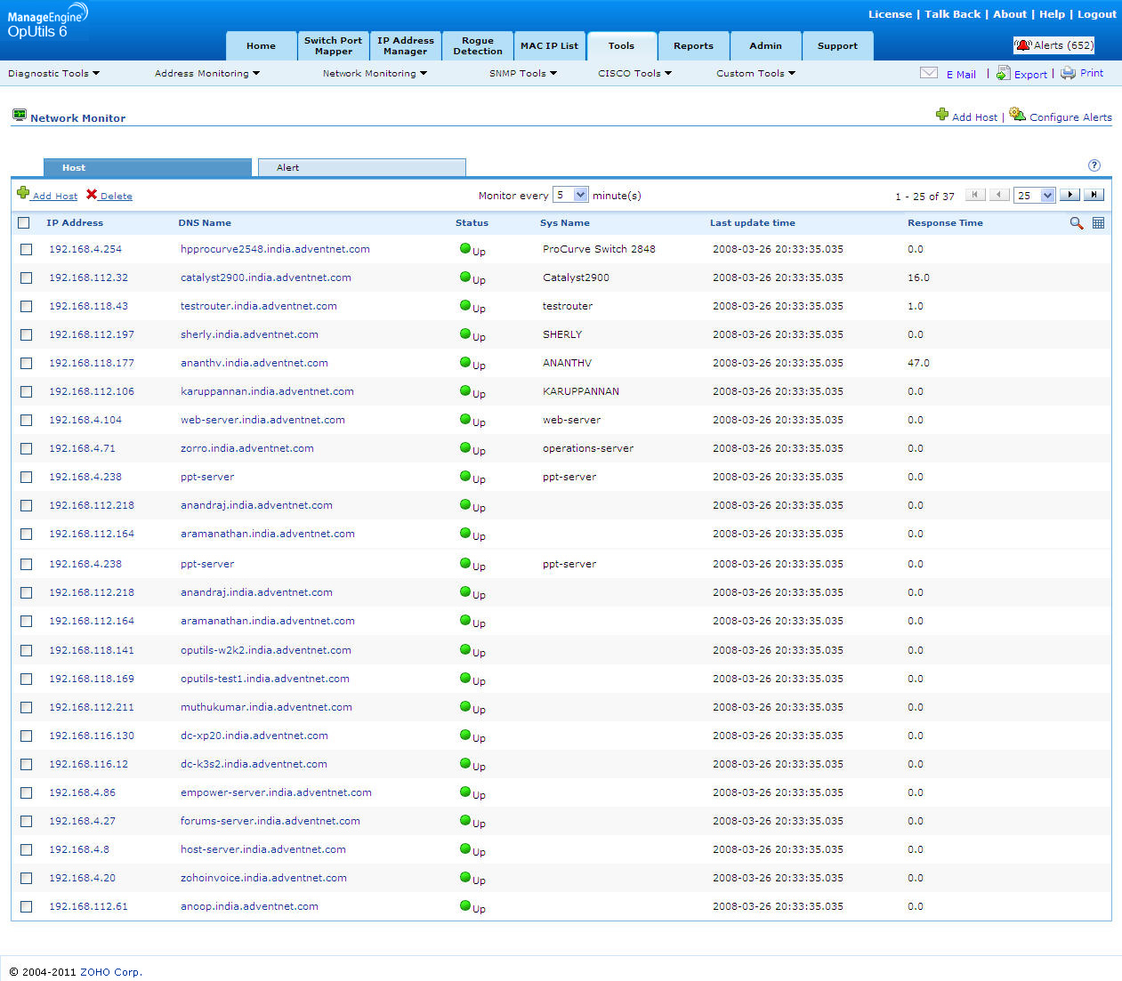 Network Monitor The tool continuously monitors the response time of multiple devices and generates e-mail alerts based on the severity. These alerts are set up at three different levels and show the different status of the nodes. |