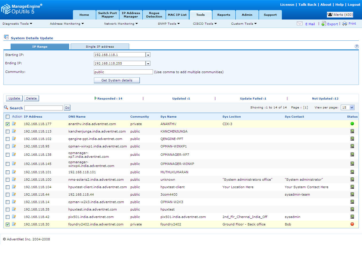 The Network Management toolset of the OpUtils software monitors network performance, calculates the bandwidth utilization, and scans the traffic for errors through SNMP. The tool also provides asset details such as the OS, installed software, and hardware and informs you about the general availability and performance of the network elements.