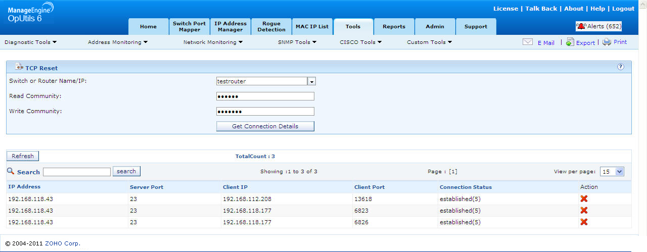 TCP Reset This tool lists all the TCP connections that are established in a device. The administrator can verify the connections and reset the unwanted/unauthorized connections from here. |