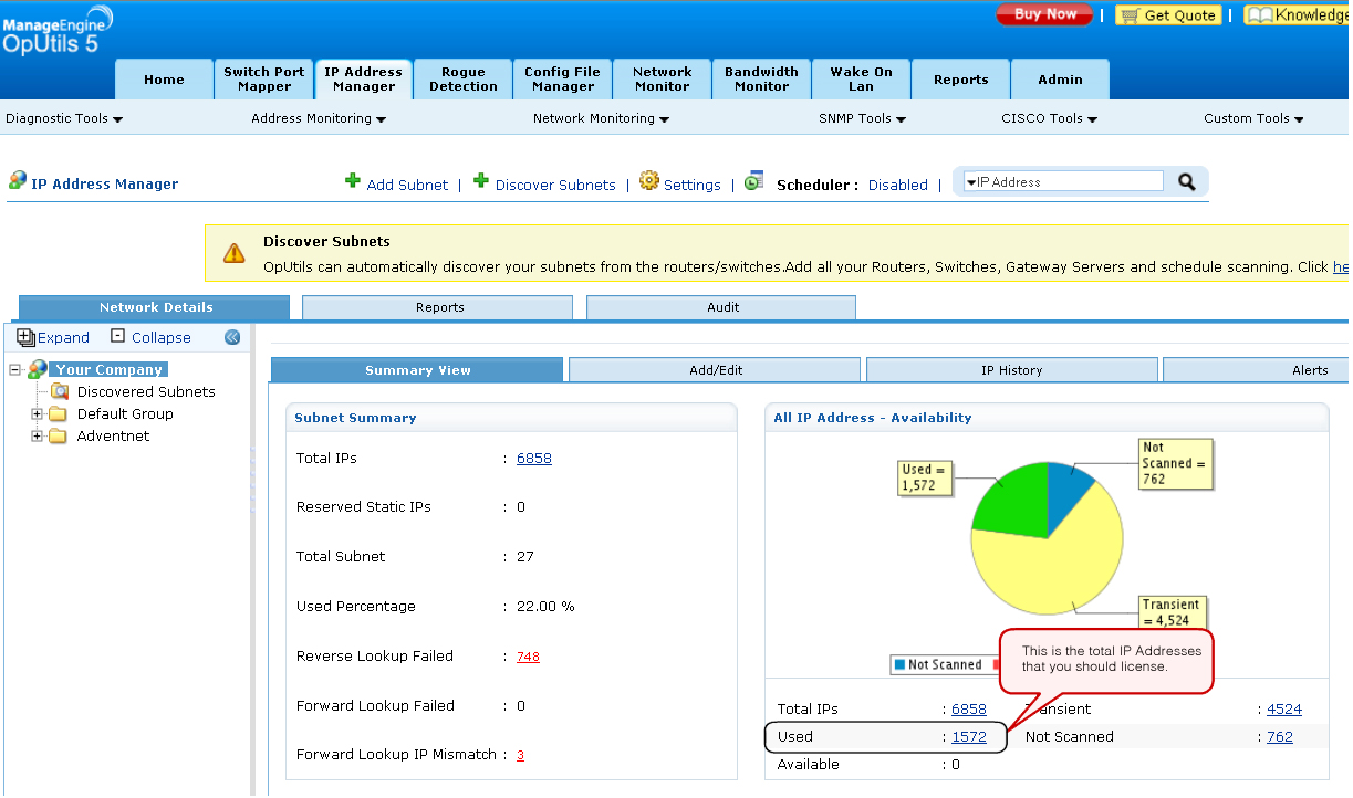 - The total number of USED IP Addresses in the IP Address Manager tool. To get the number of USED IP Addresses, add all your subnets in the IP Address Manager tool and scan. From the IP Address Manager Summary tab get the count of USED IP Addresses.