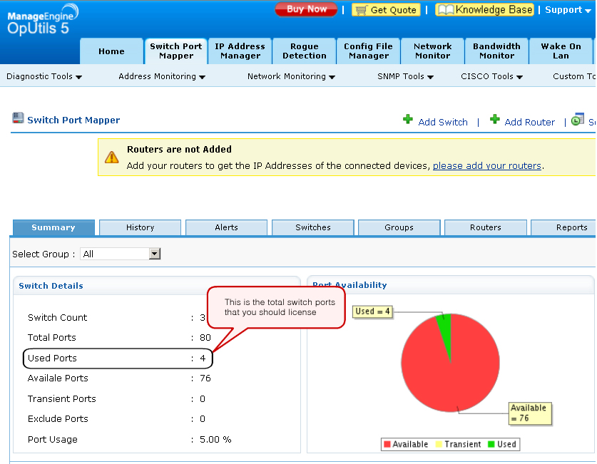 - The total number of USED Ports in the Switch Port Mapper tool. To get the count, add all your switches in the Switch Port Mapper tool and scan. Get the number of USED Ports from the Summary View of the Switch Port Mapper.