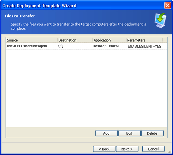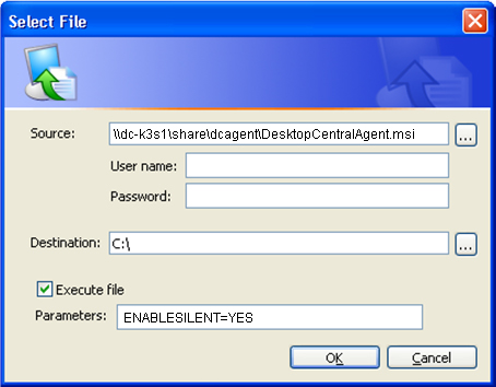 在OS Deployer post post action操作中,选择传输位于网络共享中的DesktopCentralAgent.msi,然后选择使用参数“ENABLESILENT = YES”执行此文件。