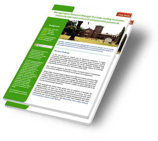 澳大利亚天主教大学是澳大利亚首屈一指的高校之一,它使用 ManageEngine Password Manager Pro 为其分布在不同地理位置的 IT 团队提供基于 Web 的集中式特权密码访问;实施密码访问控制,增强内部安全性。