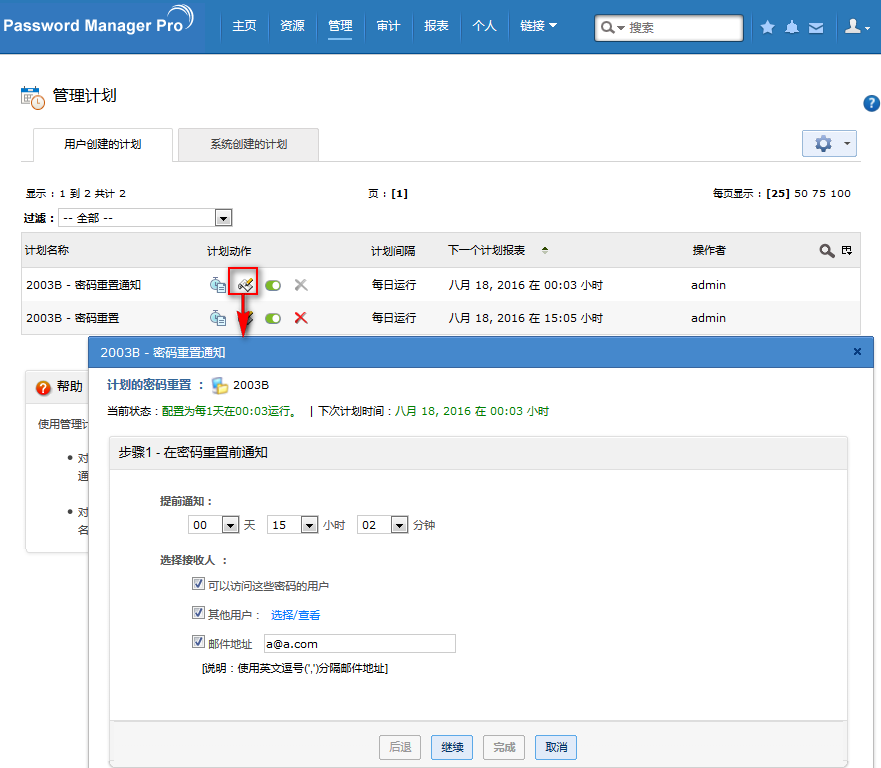 在编辑计划窗口,您可以查看每个计划的当前状态。您也可以在这里进行其它配置,如计划间隔、日期、计划开始时间以及计划执行后哪些用户会被通知。对于系统计划,编辑计划选项不可用。