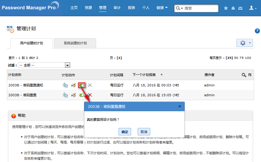 使用此功能,您可以启用或禁用任何用户创建的计划。当前不支持禁用或启用系统创建的计划。