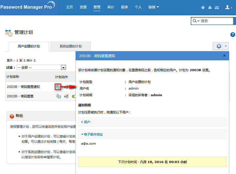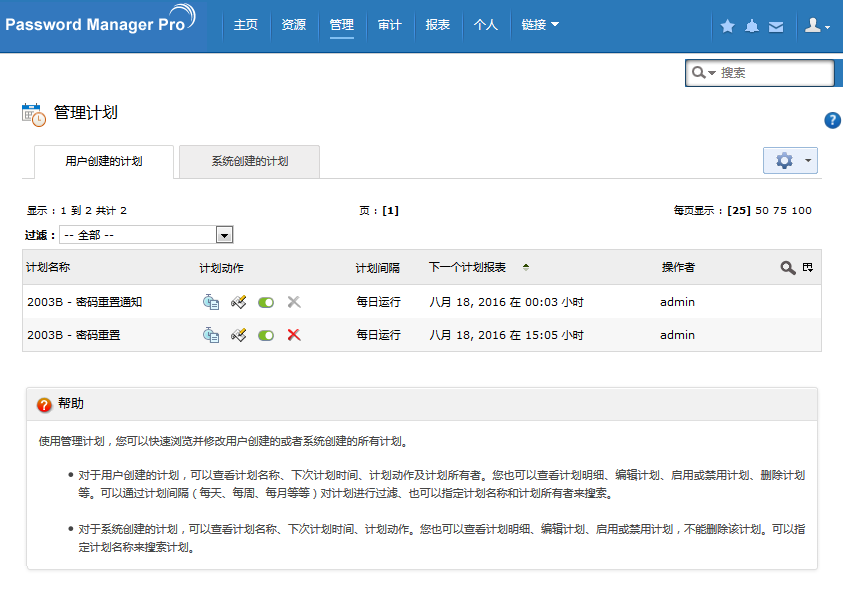 Password Manager Pro为您提供了管理计划功能,让您可以快速的查看、编辑用户或系统创建的计划。帮助IT管理员轻松的管理所有计划。用户也可以从这里启用、禁用或删除计划。