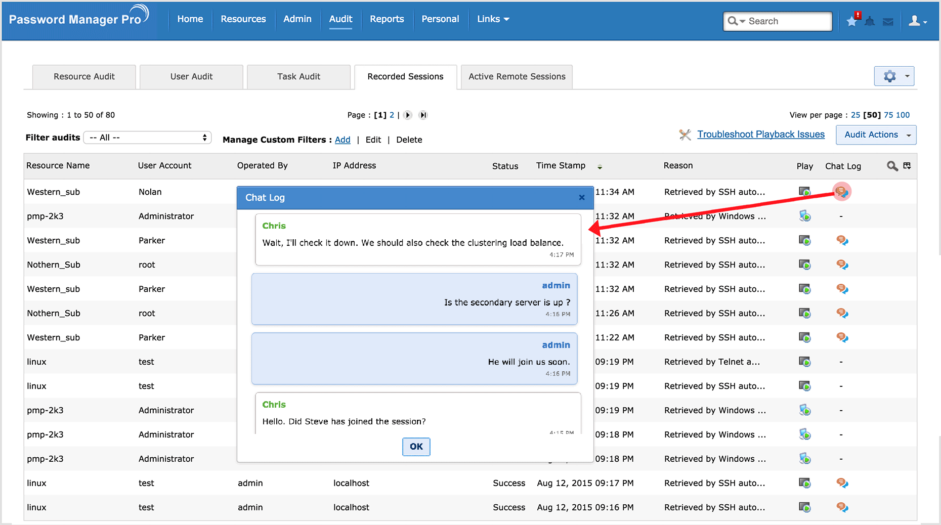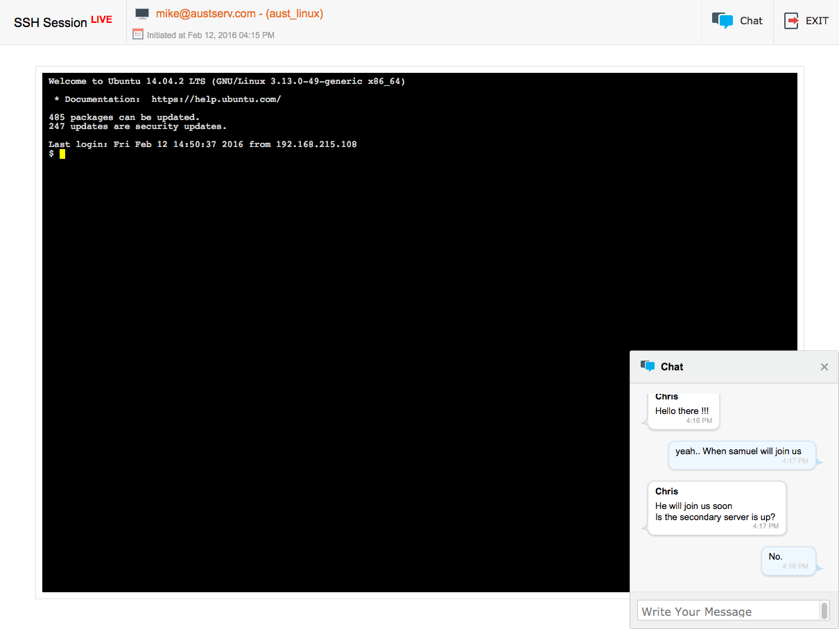 在监视远程会话时,IT管理员经常需要指示用户执行某些命令。为了达到此目的,Password Manager Pro为您提供了一个会话应用,可以进行SSH和Telnet会话。多个用户可以建立一个会话组。聊天记录也可以被记录,留作审计。