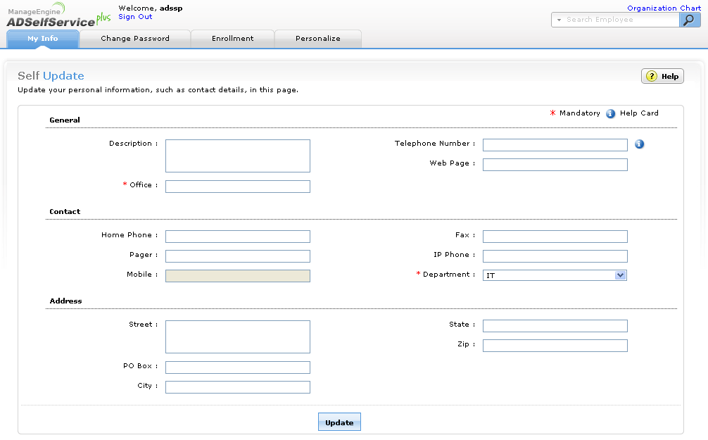 这些自助Active Directory更新可由用户自己高效地更新,方法 是通过登录至ADSelfService Plus web页面/SharePoint并更新经允许更改的字段。域用户可更改、更新或修改的字段由管理员从自助服务软件的管理控制台进行控制。允许用户自助更新自己的信息会使管理过程变得顺畅。