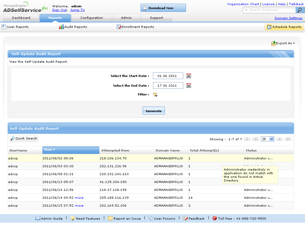通过基于web的自助访问页面向最终用户提供的受控访问允许员工在Active Directory中远程地实时更新个人信息。可使用ADSelfService Plus生成有关用户更新其用户个人资料和更新时间的报表。