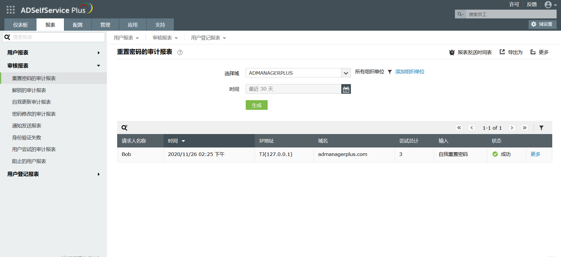 生成在特定时间段内使用自助密码重置功能的用户列表。报表提供的信息包括用户名、密码重置时间、用于密码重置的计算机、域名和密码重置类型(自助或自动)。