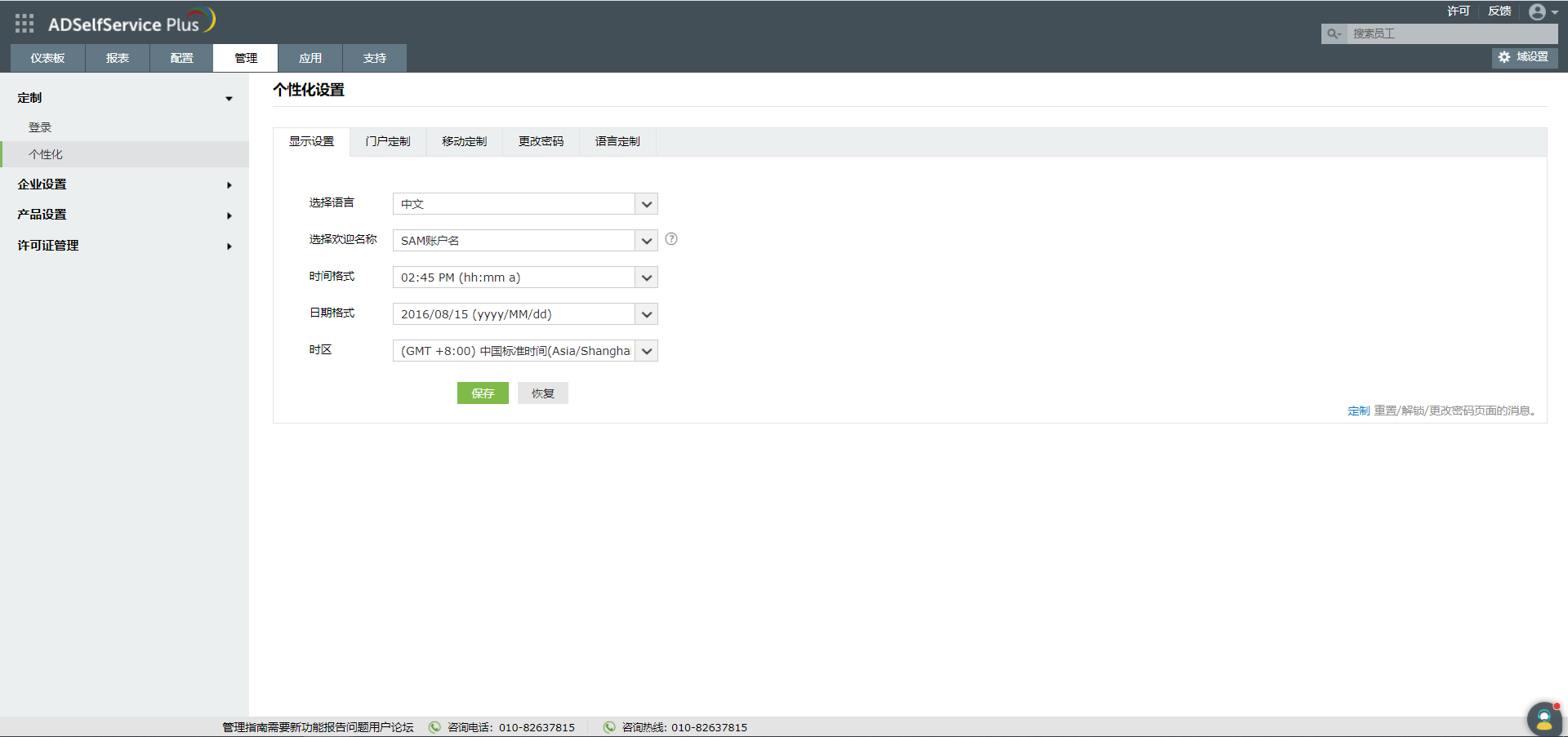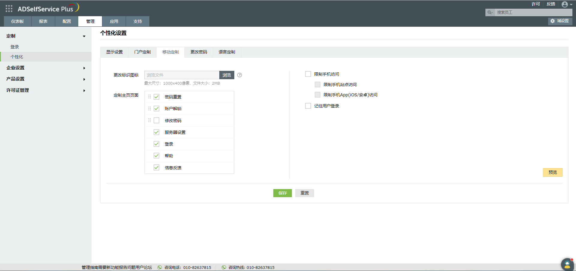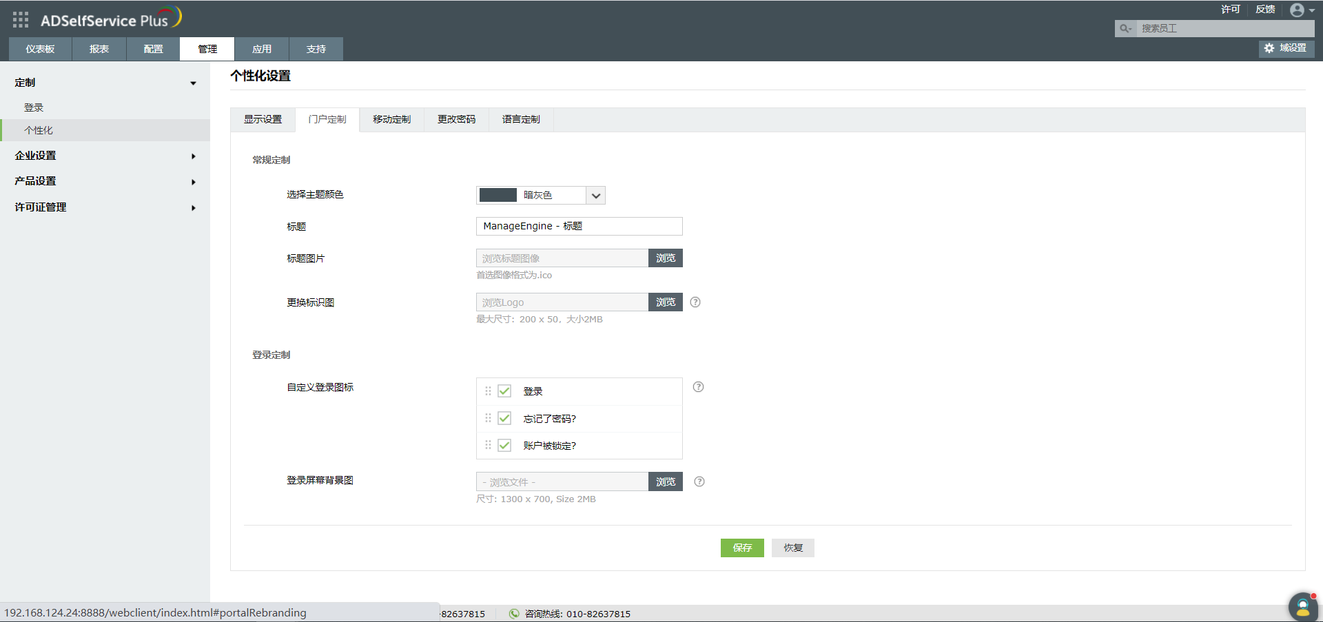 使用个性化部分下的设置来定制ADSelfService Plus的管理门户、终端用户门户和用于Android和iOS设备的ADSelfService Plus移动应用程序。