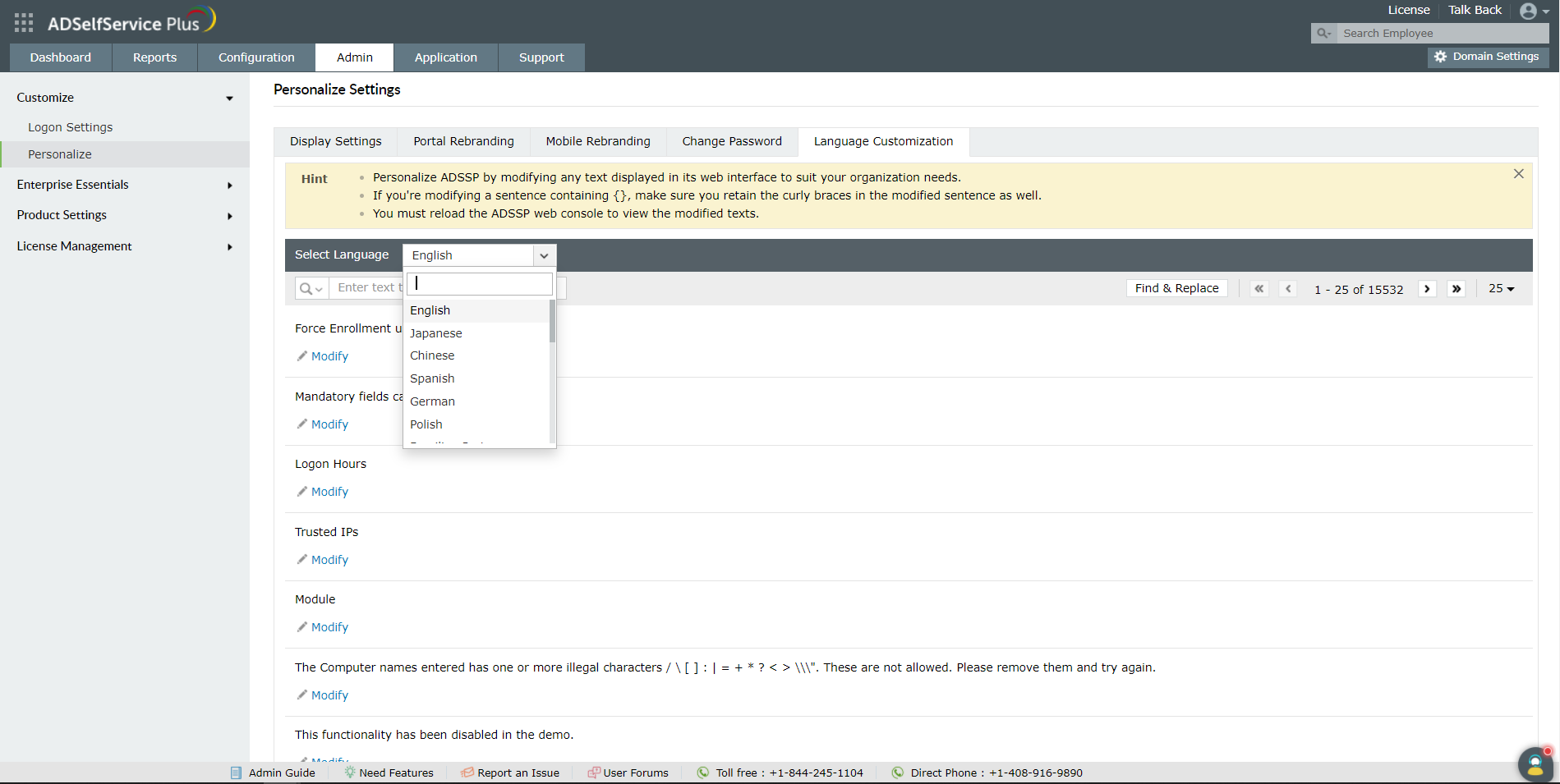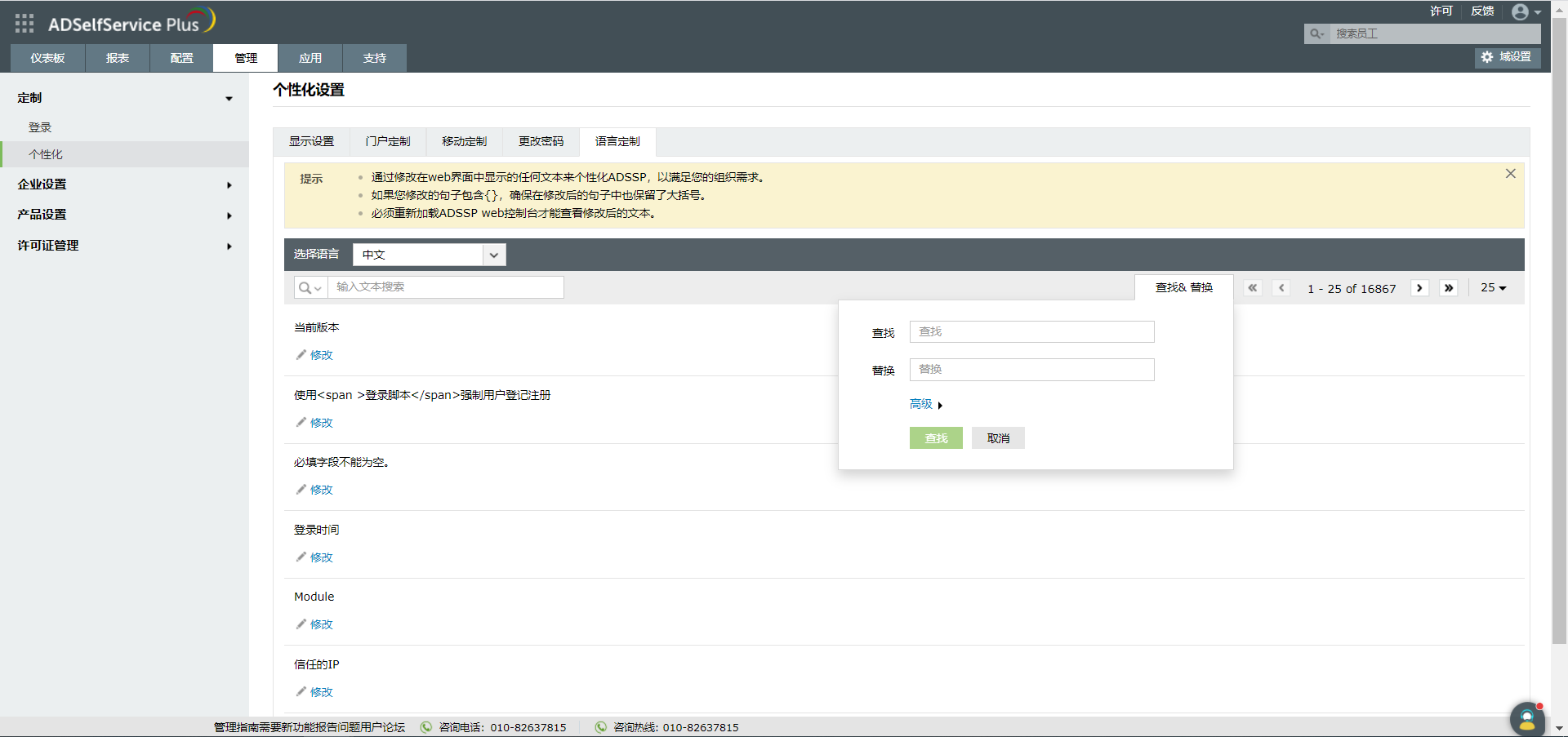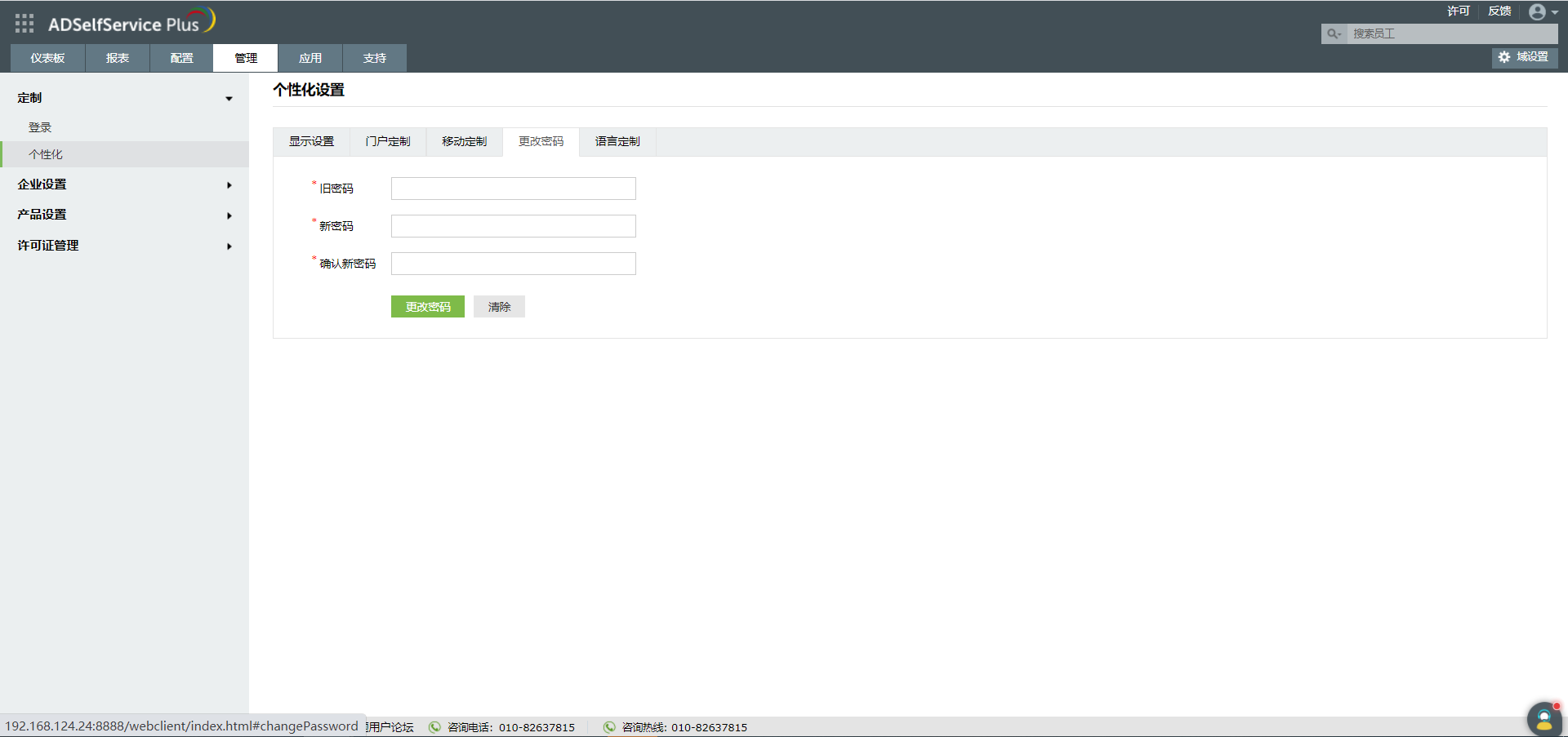 使用个性化部分下的设置来定制ADSelfService Plus的管理门户、终端用户门户和用于Android和iOS设备的ADSelfService Plus移动应用程序。