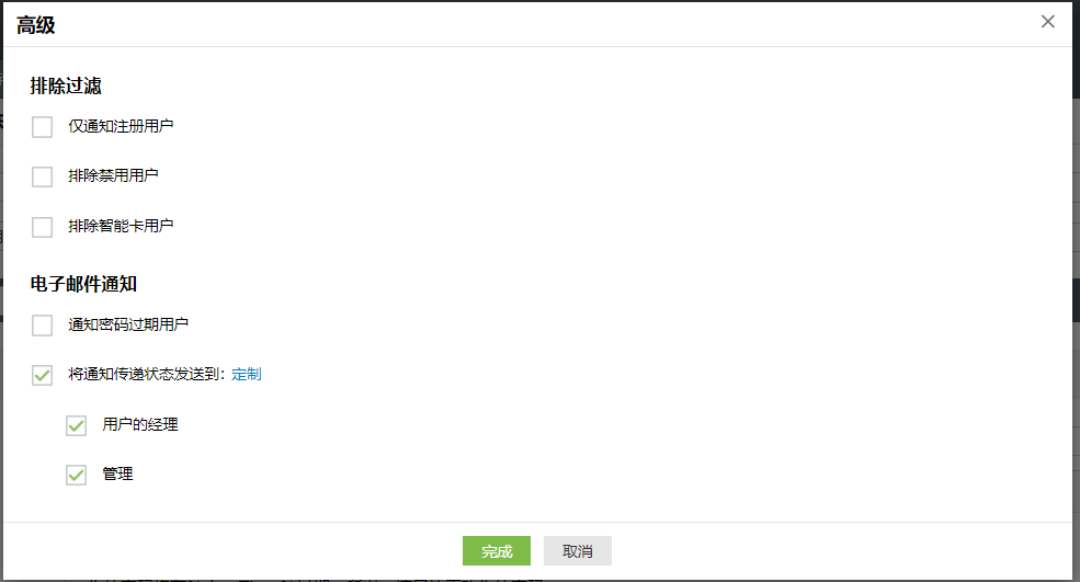 - 在高级弹出窗口中,您将看到排除未注册用户、已禁用用户或智能卡用户不接收到期通知的选项。