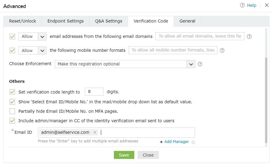 - 将管理员/经理包含在发送给用户的身份验证邮件的抄送中:使用此设置将用户的经理或管理员的电子邮件地址包含在发送给用户的验证码邮件的抄送行中。为实现此目的,