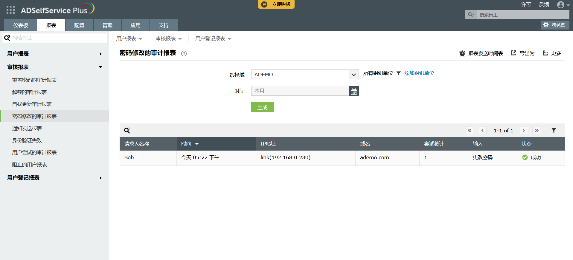生成在特定时间段内更改其用户账户密码的用户列表。报表提供的信息包括用户名、账户解锁时间、域名、尝试总数和密码更改类型(由于必须在下次登录时更改密码在 AD 中被启用,或是正常的密码更改)。