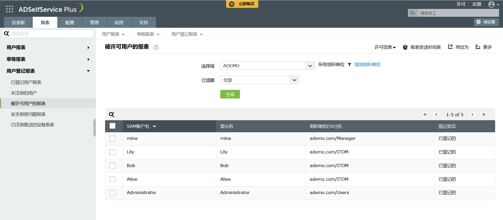 本报表提供的信息有助于有效管理用户许可证。要了解更多关于ADSelfService Plus许可证的信息,请点击这里。报表显示用户的OU和注册状态。