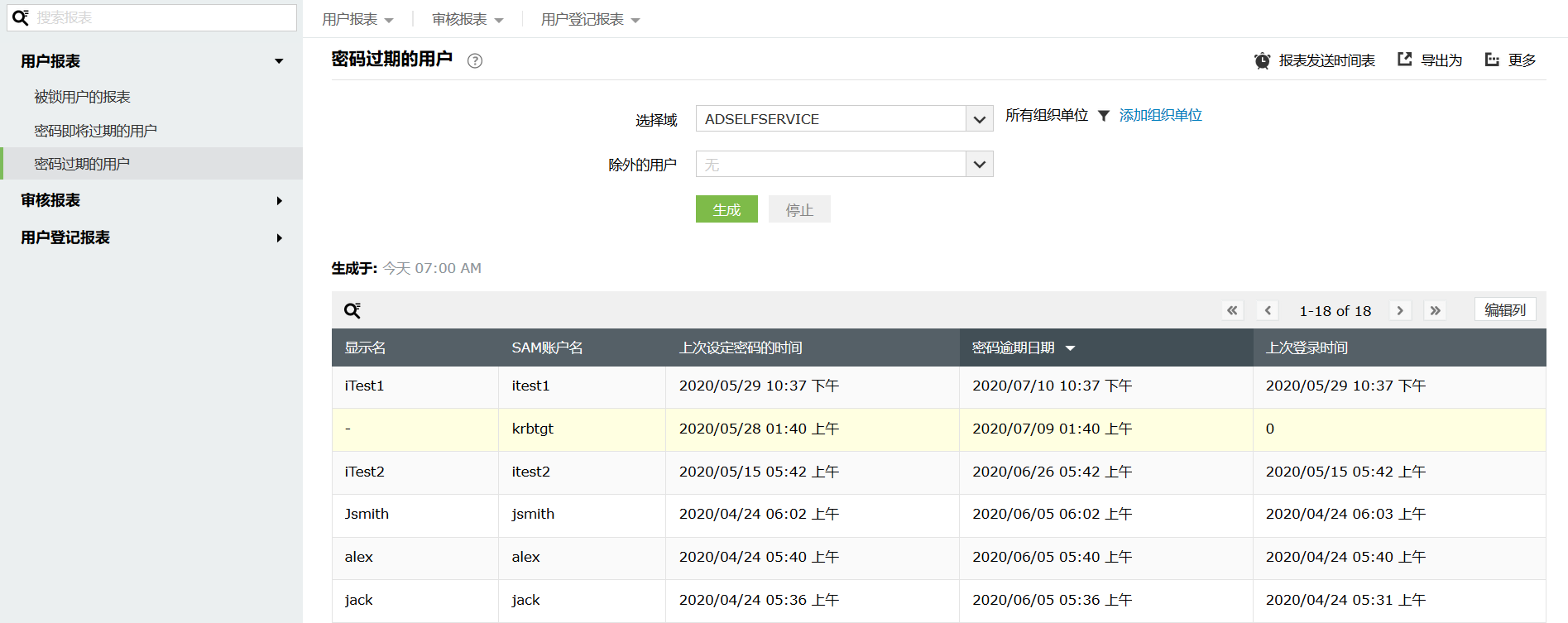 用户的域密码在管理员在AD密码策略设置中设定的一段时间后会过期。此报表包含了这些密码过期用户的列表。它提供的信息包括最后一次密码更改或重置的日期、最后登录时间和密码过期日期。
