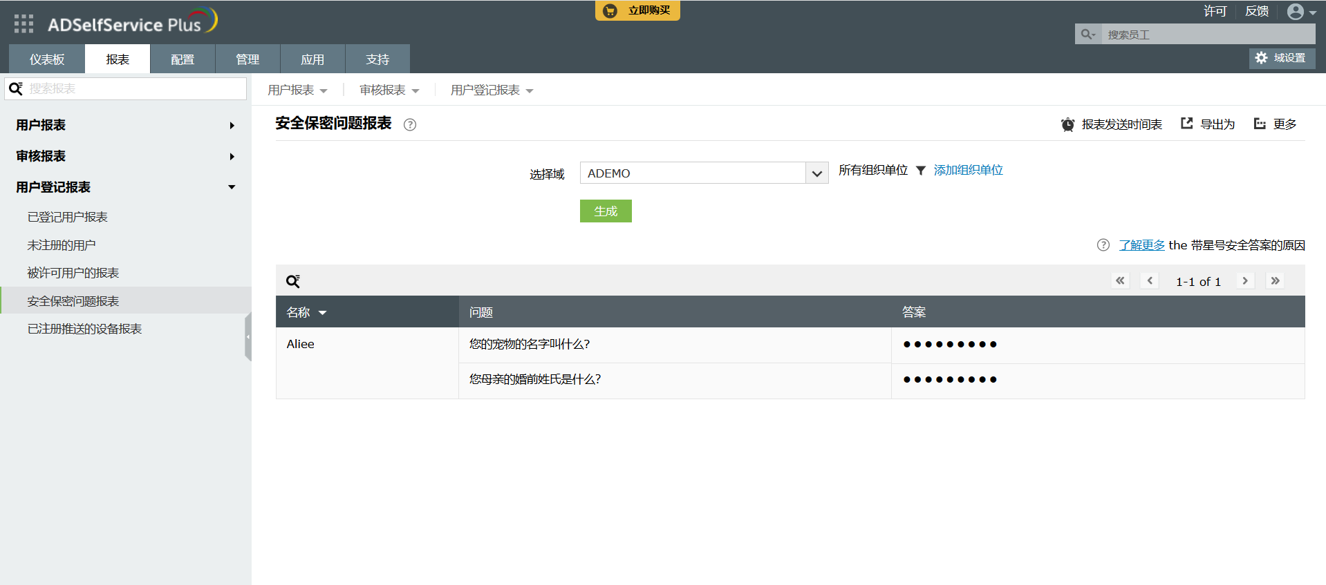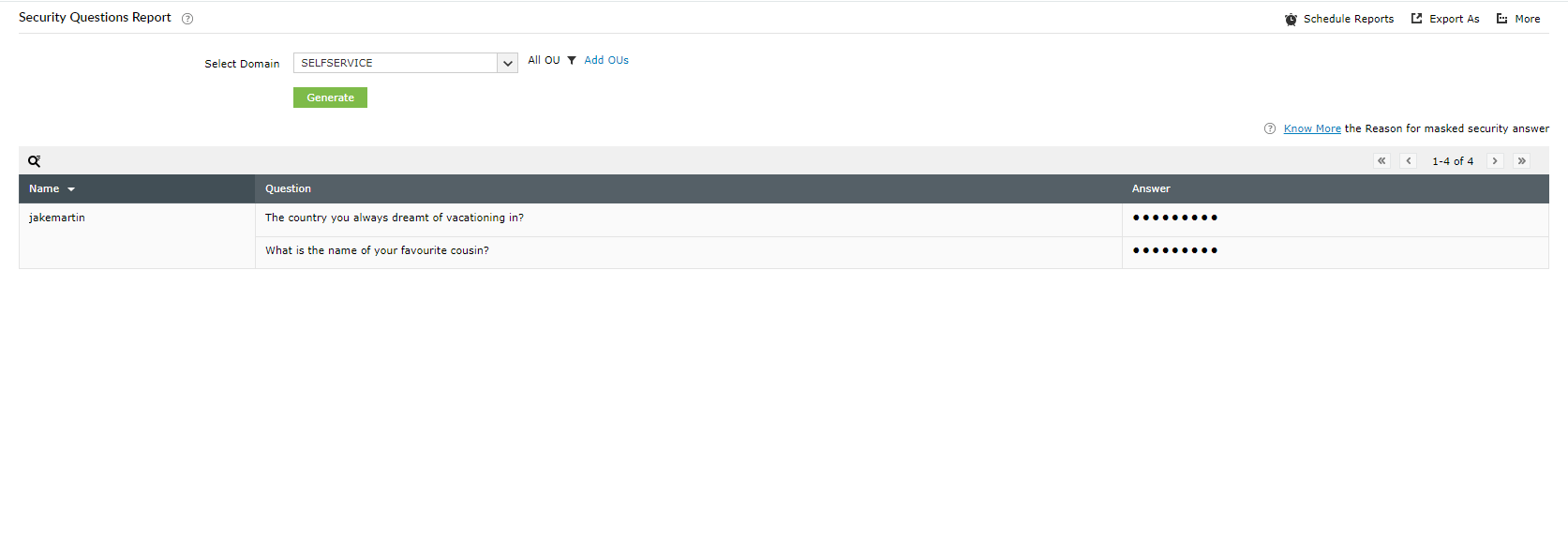 该报表生成注册用户及其相应安全问题和答案的列表。它帮助您跟踪用户为多重身份验证提供的安全问题和答案的详细信息。