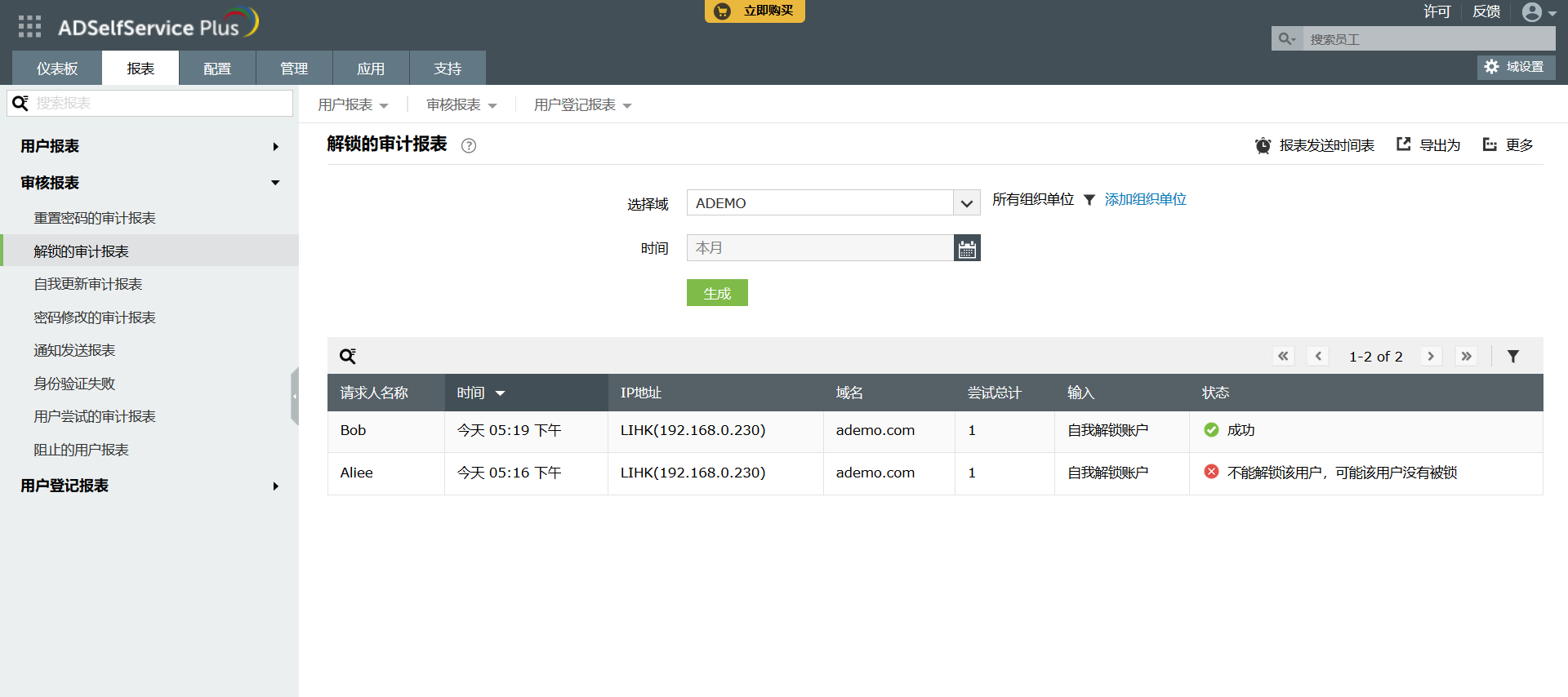 生成在给定时间段内使用自助服务账户解锁功能的用户列表。报表还包括信息,如用户名、账户解锁时间、域名、总尝试次数和账户解锁类型(自助服务或自动)。