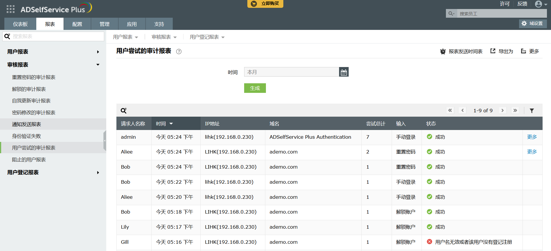 此报表生成尝试进行认证的用户列表,包括 MFA、SAML 和 NTML 认证、智能卡登录或进入自助服务门户的认证。报表中显示的信息包括尝试时间、域名、尝试次数和尝试类型。