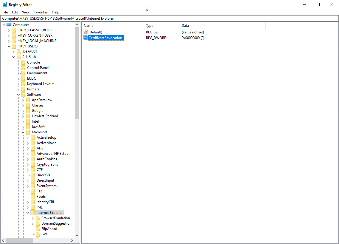 - 导航到Computer\HKEY_USERS\S-1-5-18\Software\Microsoft\Windows\CurrentVersion\Internet Settings。