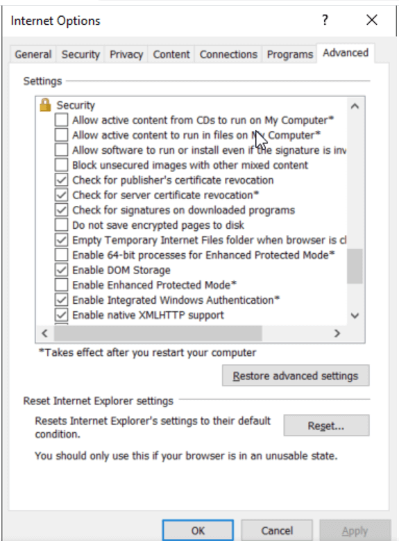 - 在Internet选项窗口中,转到高级选项卡并在设置列表中向下滚动至安全组。