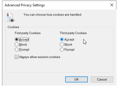 - 在高级隐私设置窗口中,选择一方 Cookie和第三方 Cookie下的接受单选按钮。
