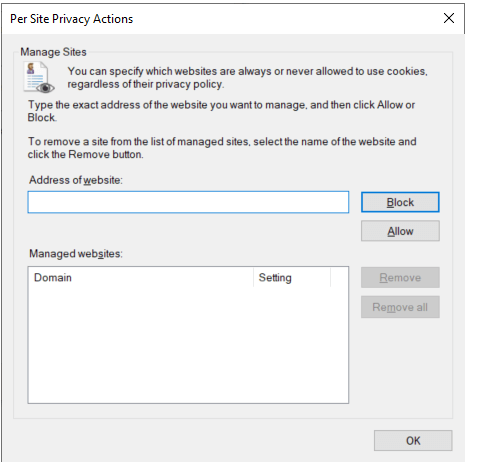 - 按 确定 以关闭 每站点隐私操作 和 Internet 选项 窗口。