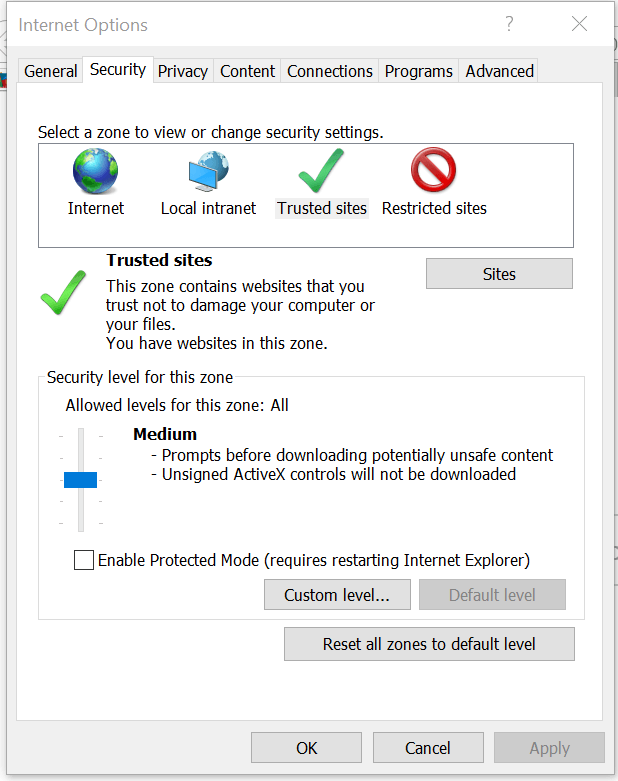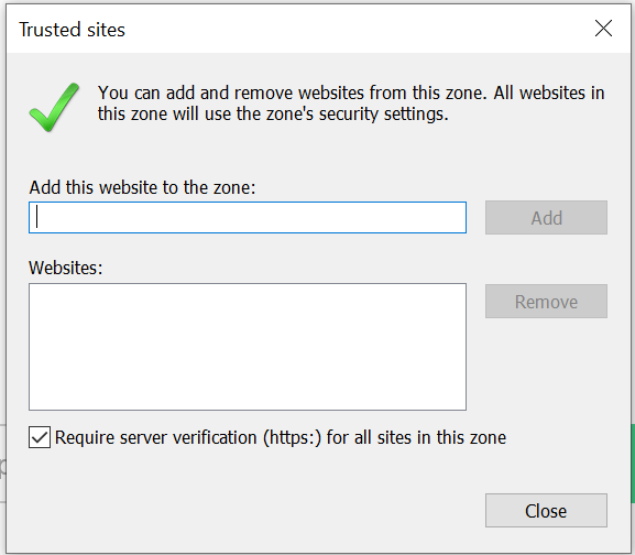 - 单击 站点,在 选择一个区域查看或更改安全设置 字段下,打开 可信站点 窗口。