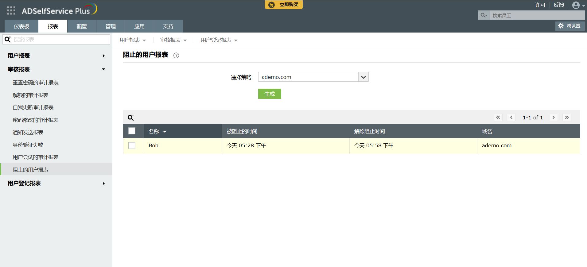 生成已被阻止访问ADSelfService Plus的用户列表。该报表提供诸如屏蔽时间、用户将被解除屏蔽的时间和域名等信息。