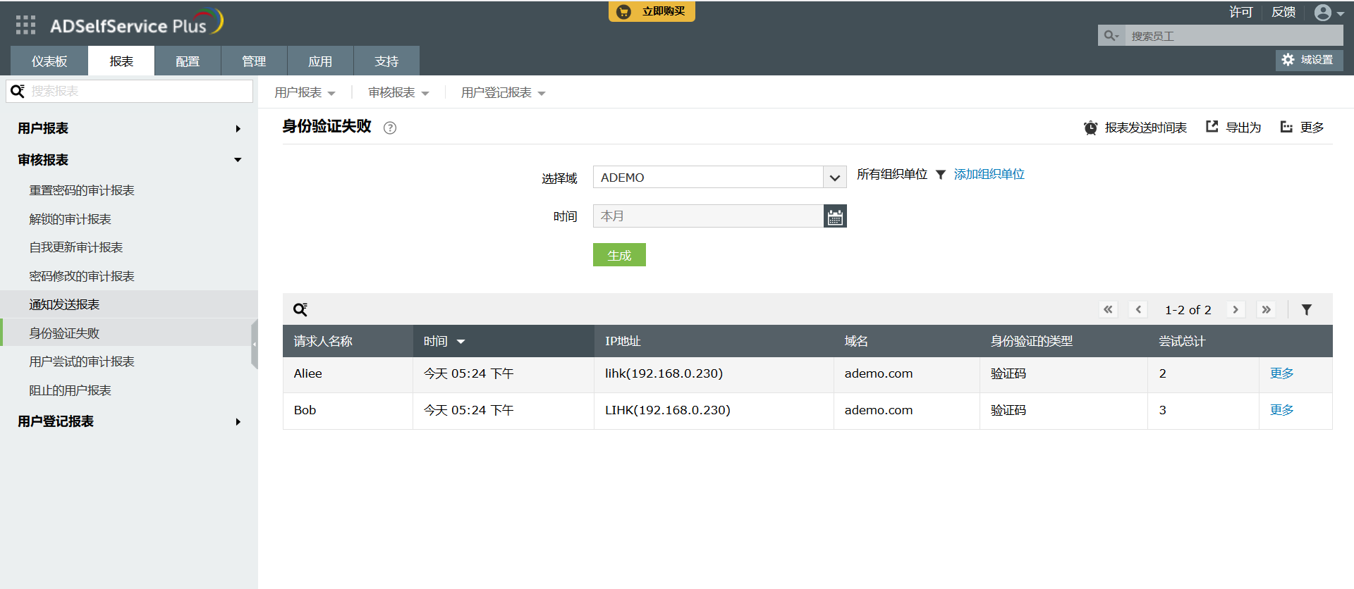 本报表生成了在多因素认证失败的用户列表。本报表提供的信息包括失败的时间、域名、尝试总数以及身份验证(多因素认证)的类型。这些信息帮助管理员处理安全风险,比如蛮力和字典攻击。