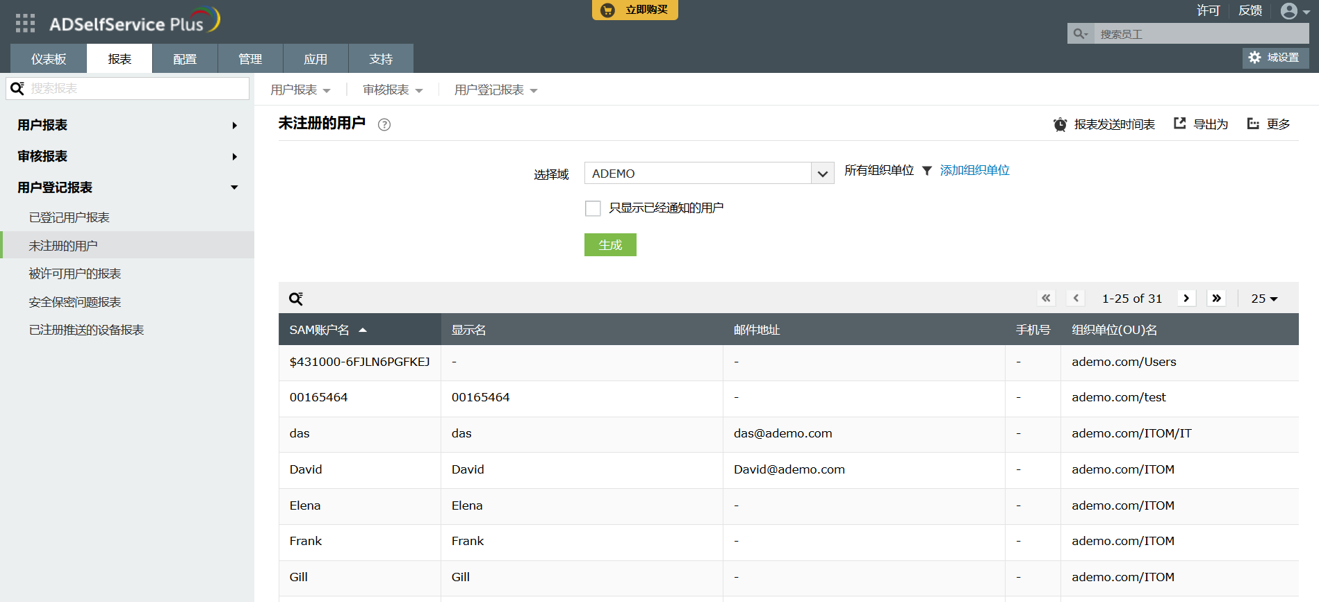 未注册用户报表突出显示了尚未注册ADSelfService Plus应用的用户列表。这包括没有分配ADSelfService Plus许可的用户,以及拥有ADSelfService Plus许可但尚未注册该产品的用户。该报表还显示用户的邮件地址和手机号码,以及他们所属的OU。