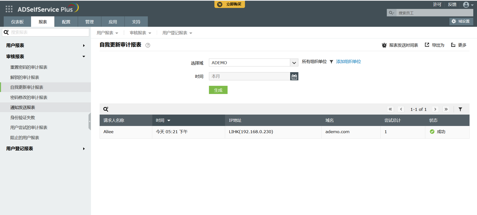 生成在一段时间内执行目录自更新的用户列表。报表提供的详细信息包括用户名、自我更新时间、域名和尝试总数。