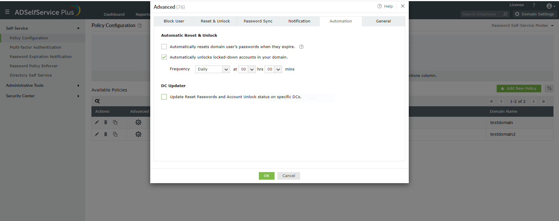 ADSelfService Plus supports organizational unit (OU) and group-based policy enforcement. IT admins can configure schedulers to check for locked out user accounts in specific OUs or groups, and automatically unlock accounts for those users. IT admins can also configure a similar scheduler for users with expired passwords and passwords that are about to expire.