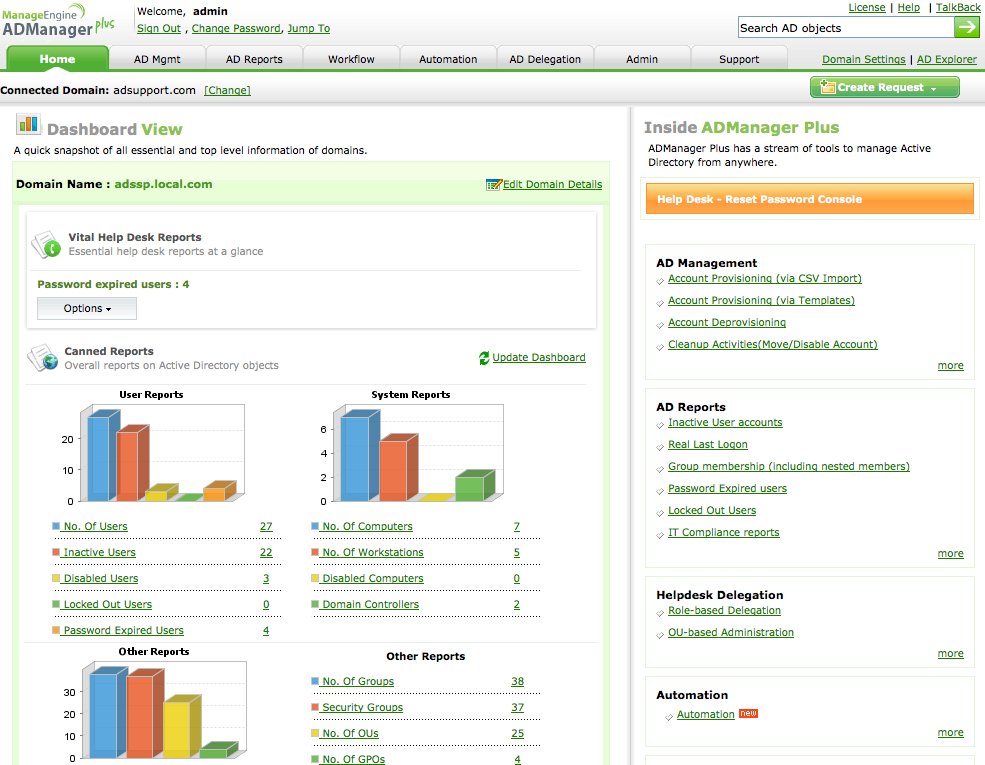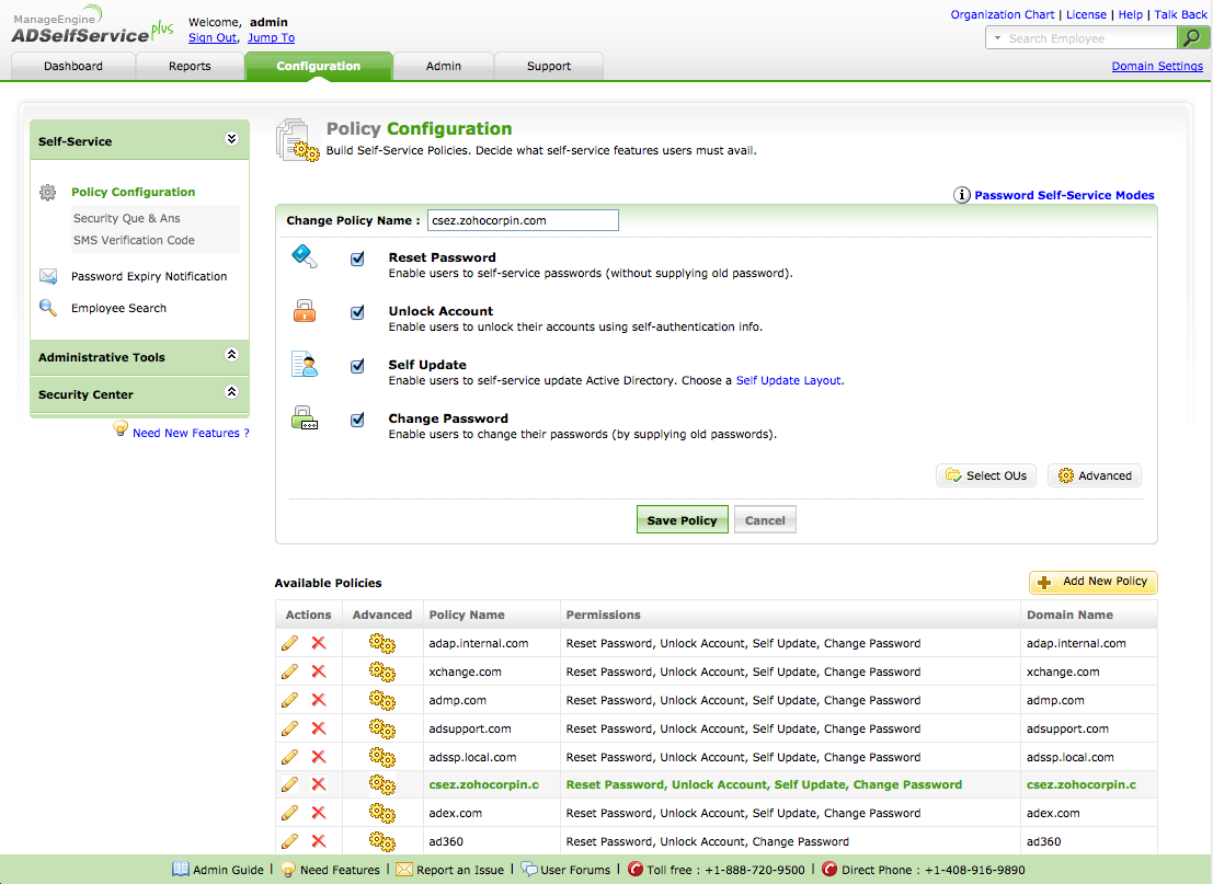 ManageEngine ADSelfService Plus is a secure, web-based password reset program for domain users to perform self-password reset, self-account unlock and self-update of personal details in Active Directory. It helps on a large scale to eliminate the leading source of helpdesk calls and associated expenses by automating password resets and account unlocks thereby optimizing employee productivity. Learn more about ADSelfService Plus from our website.